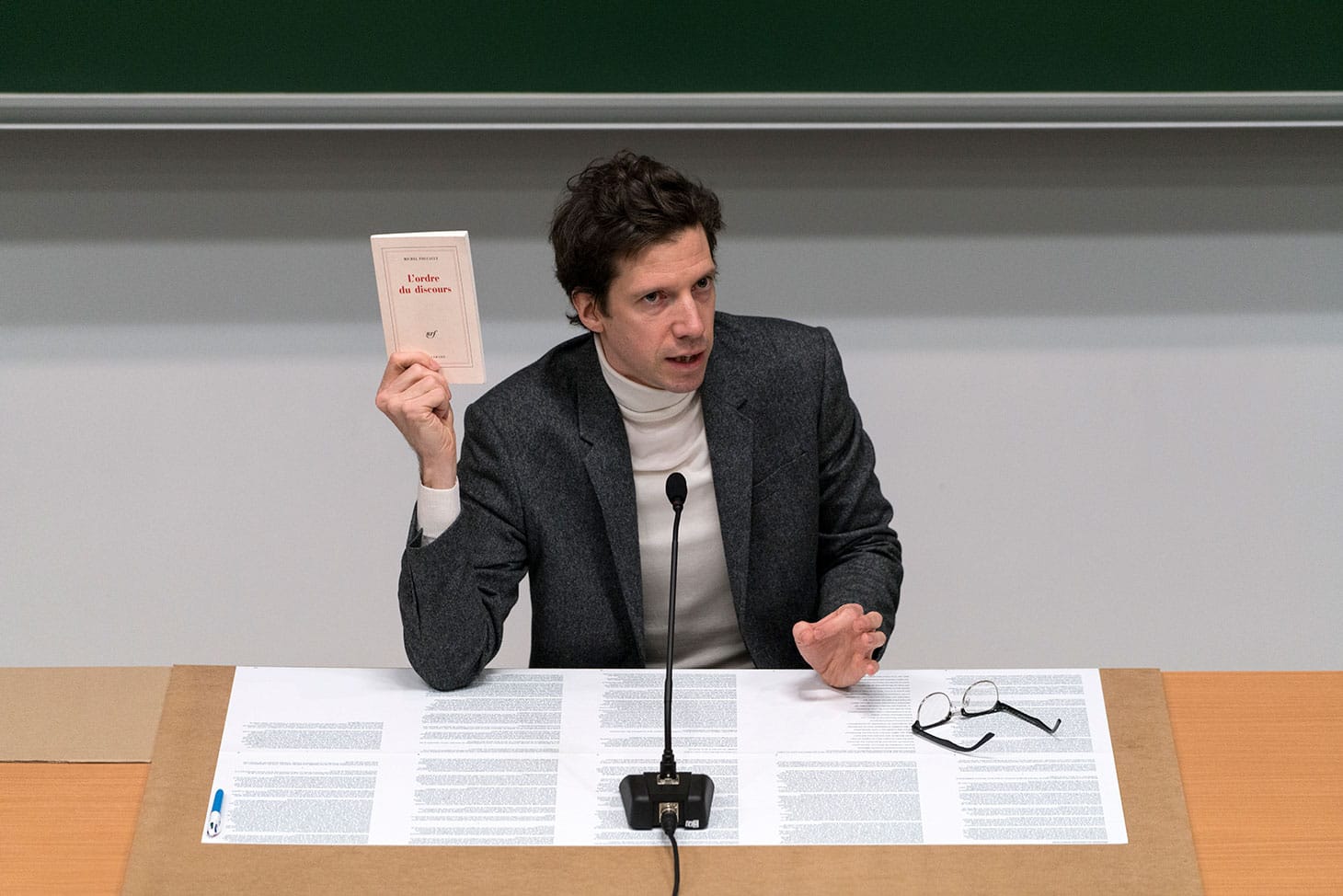 A one-man show, starring Guillaume Bailliart and staged in French, Disorder dramatizes an unrecorded but notable event in 20th century philosophy: Foucault’s delivering “The Order of Discourse” at the Collège de France, his inaugural lecture there, on December 2, 1970, in which he gives his longstanding focus on discourse a political spin by looking at the institutions that control it (or so the indispensable Internet Encyclopedia of Philosophy informs me).
