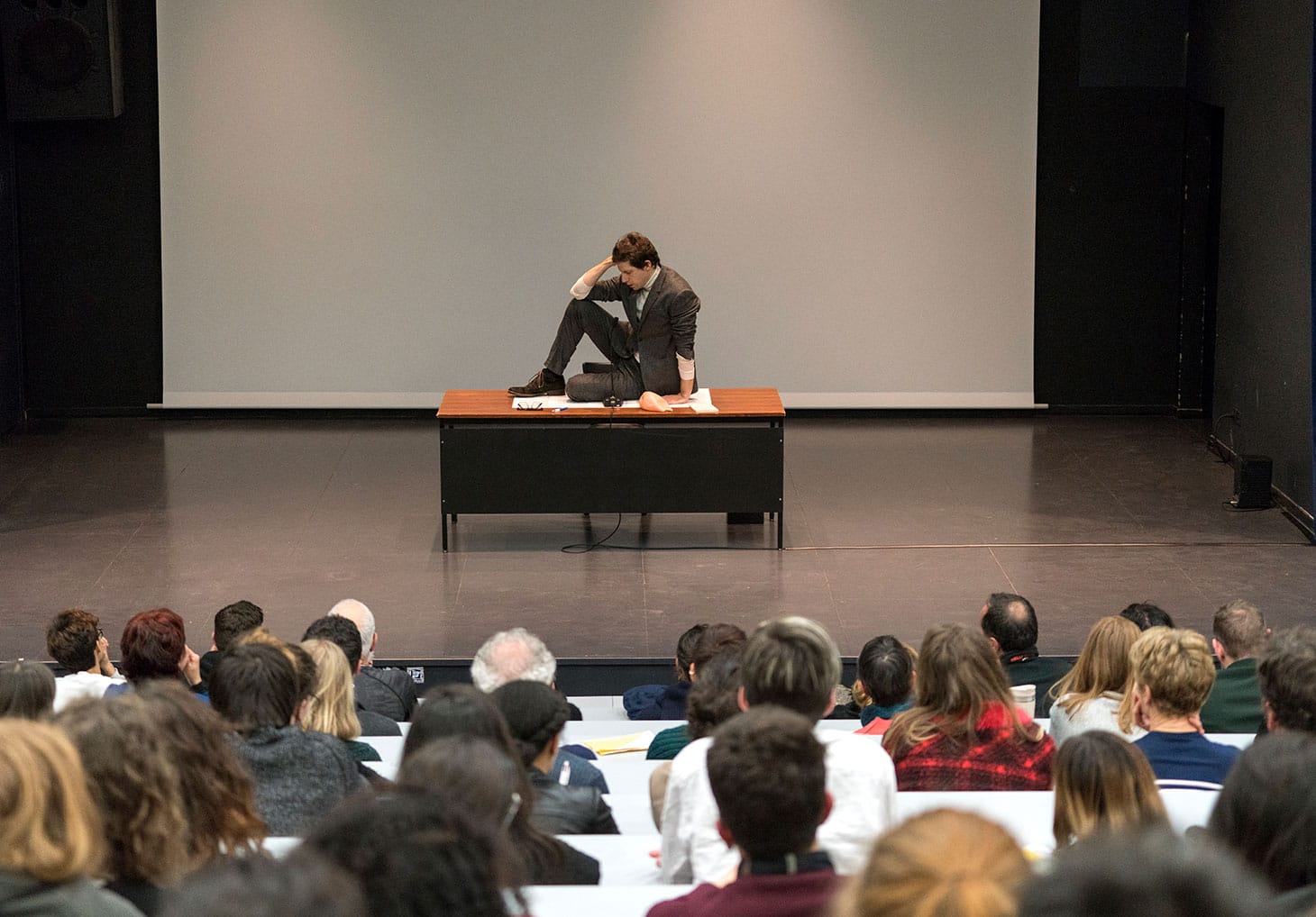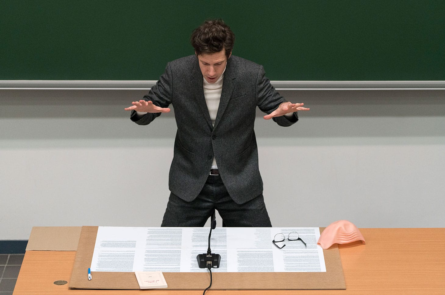 This boldly minimalist production, directed by Fanny de Chaillé, featured little more than a table, a chair, a microphone, and an actor in a white turtleneck and gray blazer who didn’t so much imitate Foucault as depict a man possessed by his own message — as though the words themselves, established at the outset as instruments of power, have come to wield power over him.
