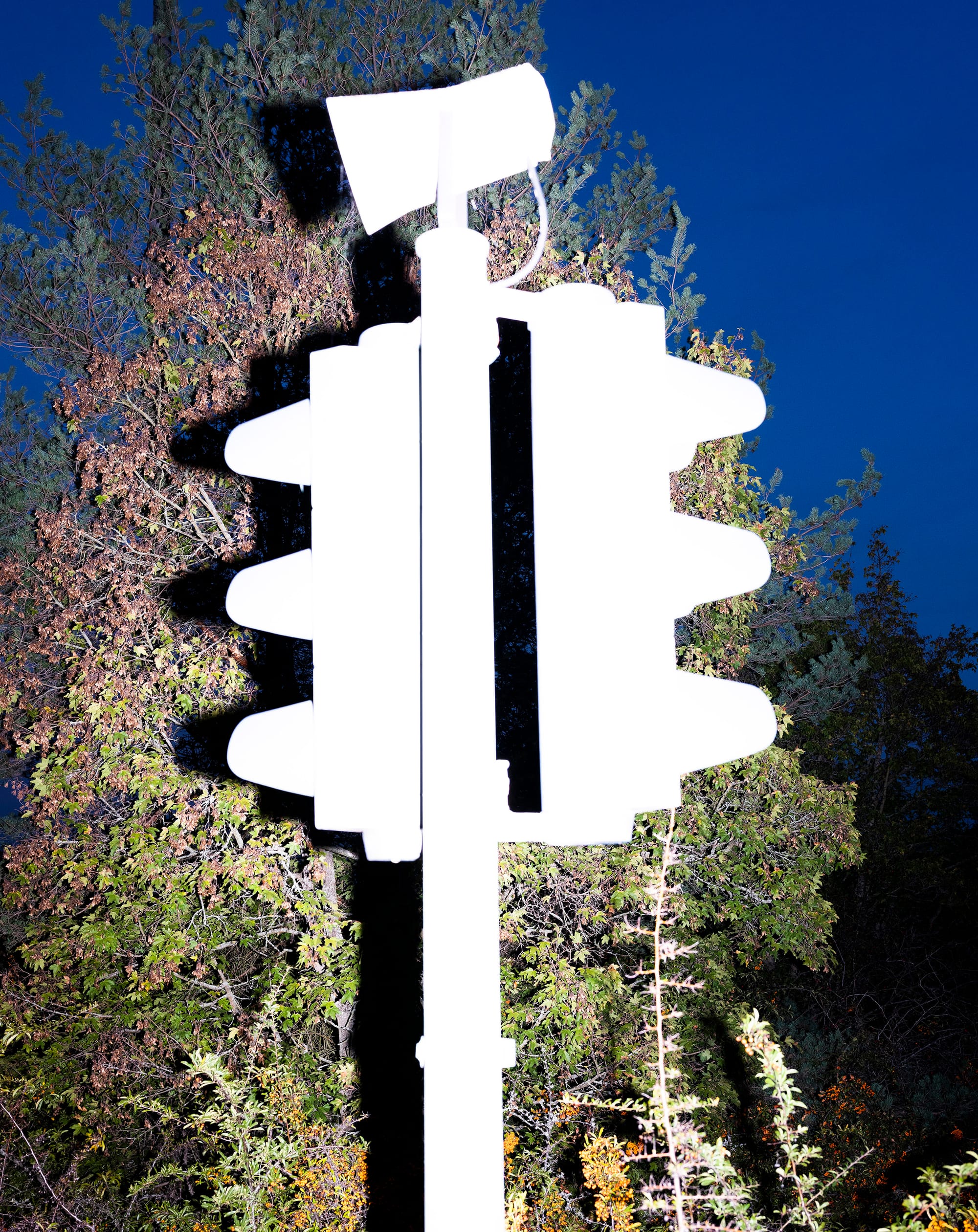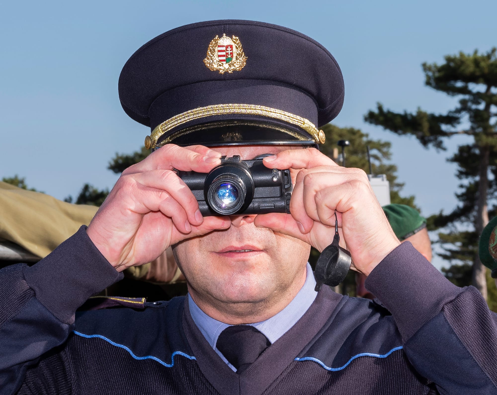 While Milach’s US-Mexico pictures capture the tenacious coexistence and violent confrontations between people and fence, his photos of the Hungarian-Serbian-Croatian border are more about a void. Also titled “I Am Warning You,” this series alternates between sweeping views of idyllic forests and farmlands surrounding the border fence and detailed shots of drones, cameras, and other surveillance equipment. The only humans on view are cropped in uncomfortable close ups of soldiers’ clasped hands and shaved heads. Though the 500-kilometer fence was built in 2015 to block the entry of immigrants, Milach notably refuses to depict them. Instead, his focus stays fixed on the disruptive architecture and clunky mechanisms in place to stop their movement.