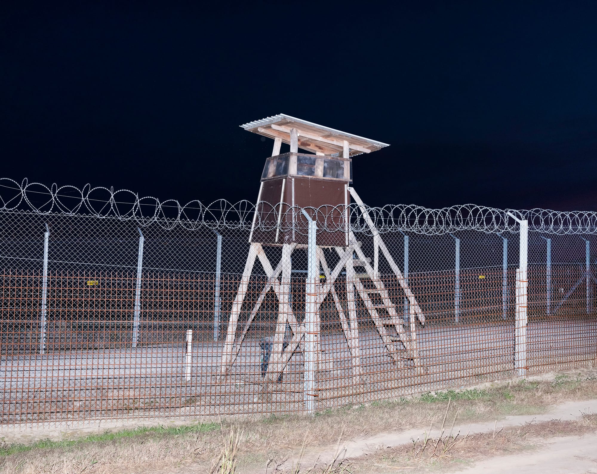 Milach says he’s drawn to border architecture because it’s a physical embodiment of the state’s control apparatus. Still, what’s most striking about his “#13767” US-Mexico series are the unsanctioned ways that regular people negotiate the border fence in their daily lives. In one photo, a group of men sit along the base of the fence, where a low-lying pipe, patched umbrella, and shady mesquite tree turn the site into an impromptu gathering place. In another photo, Milach captures a humble, handmade dwelling located mere feet from the massive fence. Though the photo doesn’t show any human inhabitants, a small collared dog peeking sheepishly from the far side of the home is an undeniable sign of domestic life. These quiet moments contrast pointedly with closer snaps shot with a harsh, flattening flash, where Milach shows pieces of adult and children’s clothing pierced and impaled by the jagged curls of barbed wire on top of the wall.
