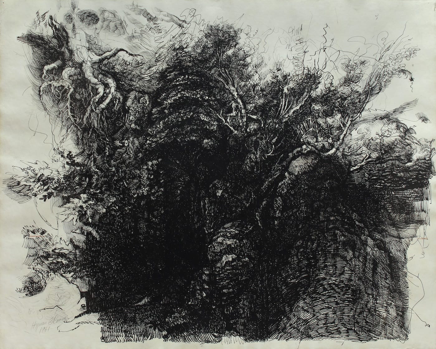 Bloom’s drawings are equally powerful. His “Landscape” (ca. 1963) and “Tree Study” (ca. 1970) are masterworks in which volume, shading, light, and line are unrivaled. He’s talking more to Albrecht Altdorfer and Matthias Grunewald than to any of his peers. He seems not to have cared one whit about the innovations of Pablo Picasso and Henri Matisse, and in that he shares something with Chaim Soutine, another artist he looked at. At times, one could say Bloom’s symbolism becomes too much, but that seems to me a quibble rather than a fault.