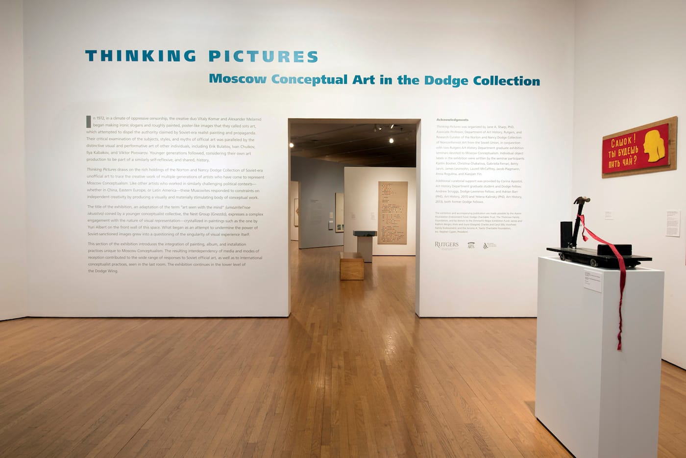 NEW BRUNSWICK, New Jersey—Thinking Pictures at the Zimmerli Museum at Rutgers University presents a broad selection of Moscow Conceptualist artworks from the famous Norton and Nancy Dodge Collection of the Soviet Nonconformist Art. The generous, tightly packed show curated by Jane A. Sharp features artworks by more than 40 individual artists and artist collectives; most of these works date from the 1960s through the ‘80s. The long-overdue exhibition is the first major presentation of Moscow Conceptualism in the United States since the influential traveling exhibition Perspectives of Conceptualism which introduced Soviet Nonconformist art to American audiences in 1991. The 25 years separating the two exhibitions have brought about drastic political, social, and technological changes: from the official dissolution of the Soviet Union and the emergence of Putin’s authoritarian rule in post-Soviet Russia, to the rise of the internet and social media, the escalation of international terrorism, and the recent upsurge of populism in Europe and the United States. The political and cultural lethargy of the late Soviet Union, which generated the small underground art movement of Moscow Conceptualism, has little in common with the troubled condition of today’s America. But, surprisingly, many of the works in Thinking Pictures seem to resonate with our present-day reality, and some of them appear to have acquired new meanings, offering unexpected insights for our tempestuous times.