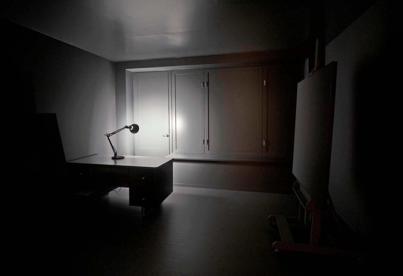 Unlike Kabakov’s discursive installation crowded with dozens of imaginary voices, “The “Room No. 3” by Irina Nakhova swaddles the viewer in darkness and solitude. A small room of roughly 13 by 13 by 8 feet contains a single window, a balcony door, an easel, and a desk; every object and surface in it is painted dark gray, and the only light source is a desk lamp, which throws a narrow cone of light on the blind window. The piece is one in a series of installations created by Nakhova in her Moscow apartment between 1983 and 1987; each of these works transport the viewer from the dreariness of the Soviet standardized, collectivized existence into a private, dreamlike world.