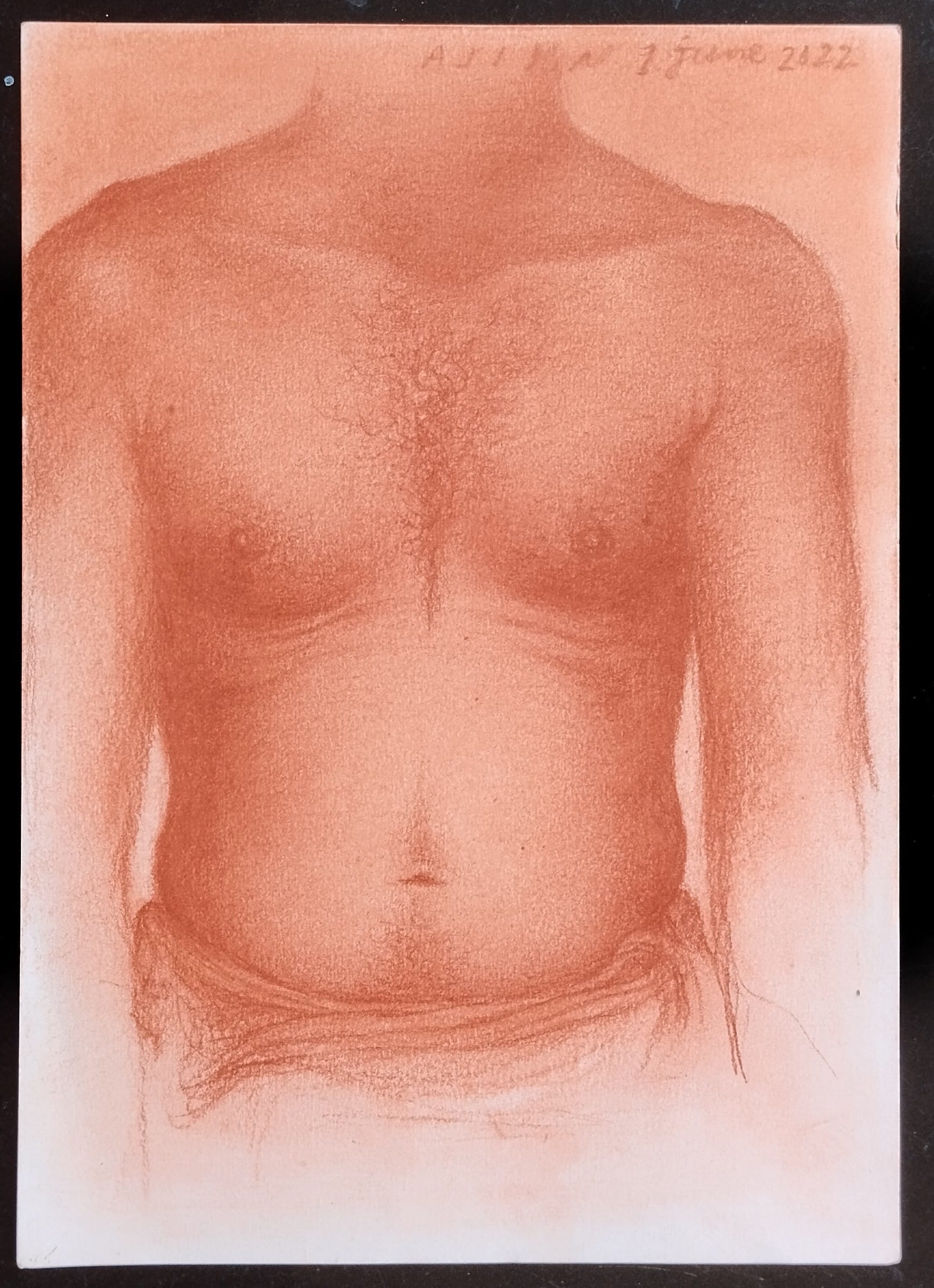 Aji’s bifurcated practice reflects his experience of living and working in two different worlds, as well as his profound interest in tradition Western processes, such as charcoal drawing and oil painting, and in materiality: the unique qualities of charcoal, pastel, and oil paint. This division became clear to me as we sat in his studio, looking through drawings he had done when he was in the Netherlands (to which he periodically returns to see Uma) and the paintings on his studio walls, which he made in Thiruvananthapuram. They differ in subject matter and materiality, though both convey his preoccupation with tonality.