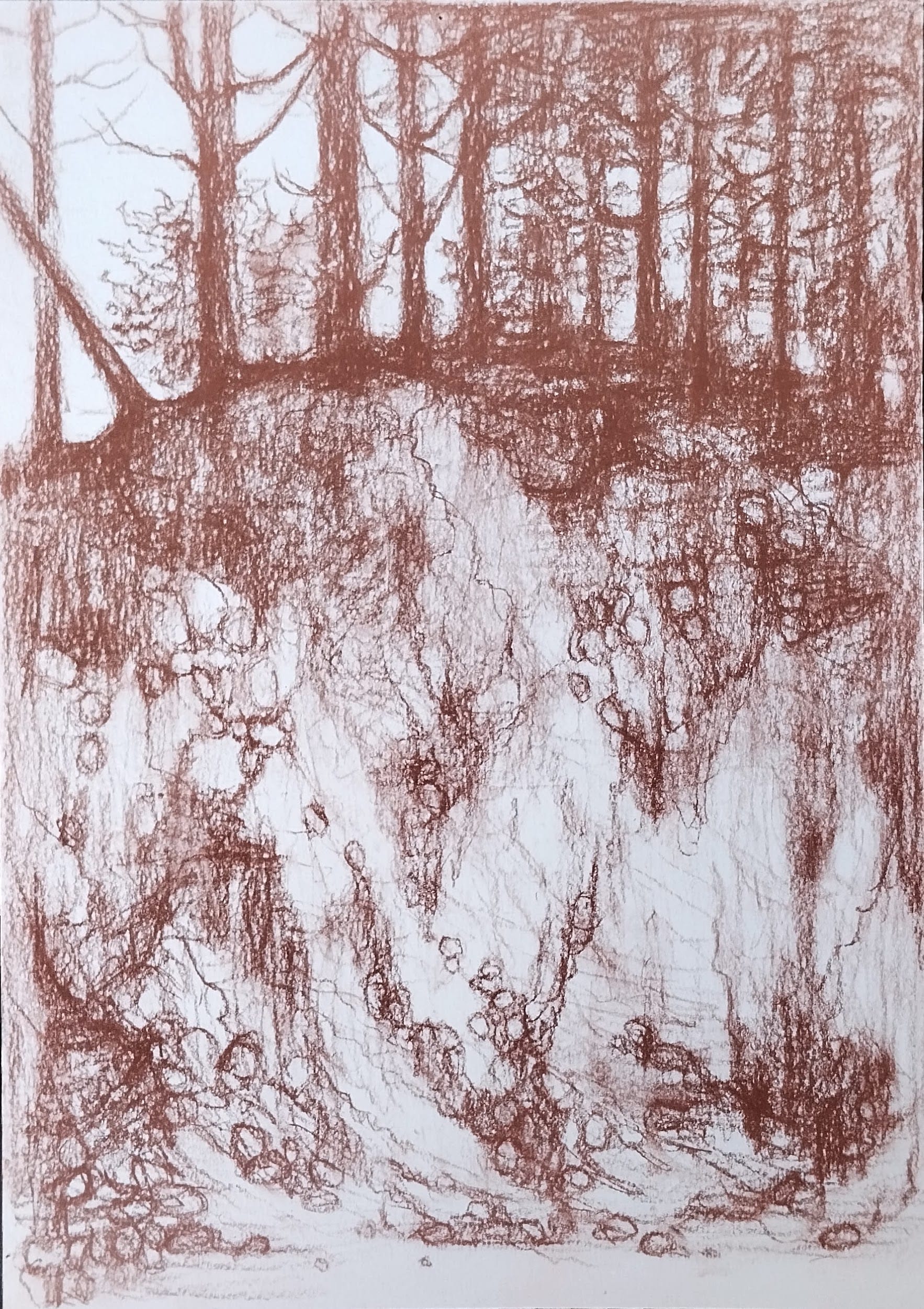 Erosion and rampant growth are recurring subjects, as this painting and the drawing of the trees with exposed roots indicate. In this way, the damage humankind has been doing to this planet is an underlying themes of the artist’s work. When we discussed his use of color in the drawings and paintings, he said that he wanted the drawings to be removed from their subject by using colors that are not natural to their existence. In the paintings, the limited palette and the light he gets through tonality enhance the unsettling feeling his views invoke. He is both an observational artist and a visionary who depicts two distinct but interconnected worlds, the internal and external.