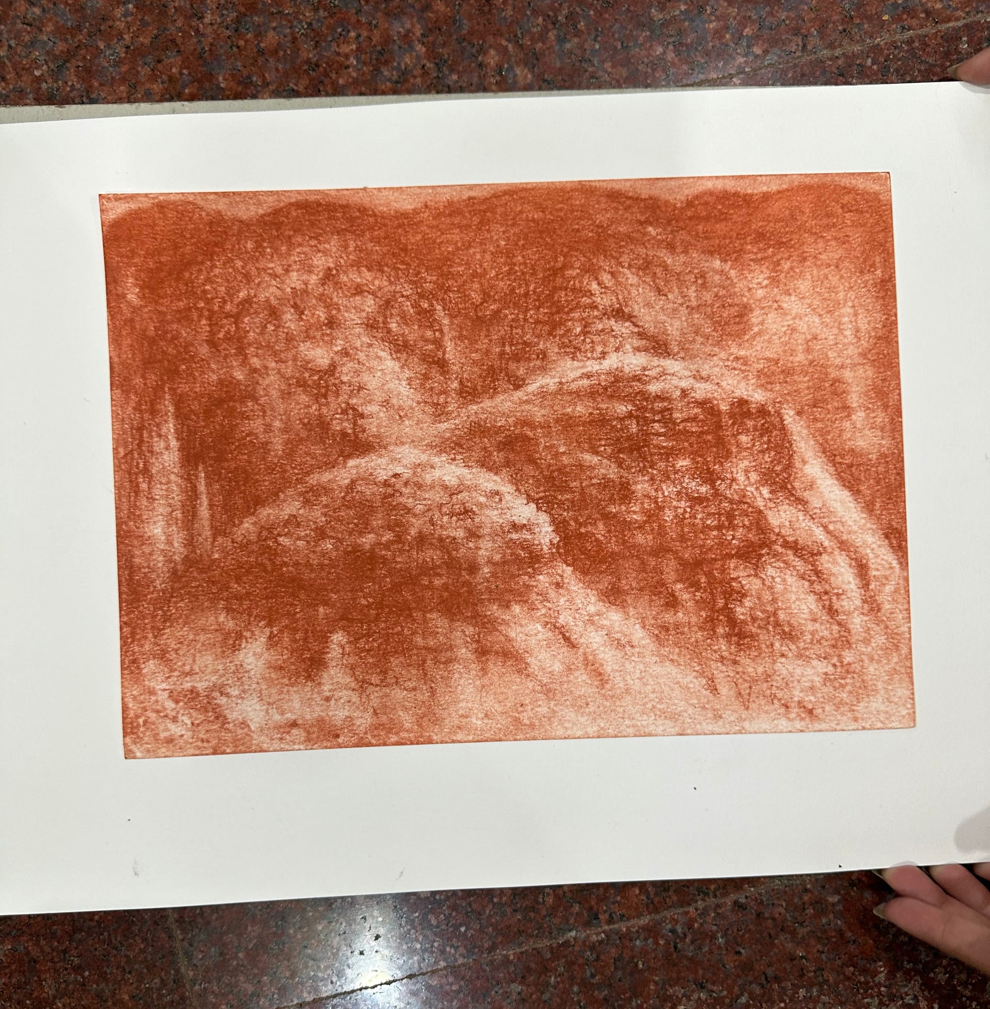 In an untitled oil on canvas (2020), Aji depicts a high, bulbous mountain lined with boulders, or smooth clumps of dirt, using a tonal palette dominated by russet and a few greens. Trees extend along the right side of the mountain, ending in front of the hill. The boulders or mounds seem to be hanging off the side of the ridge, like a stack of cocoons. Where did they come from?