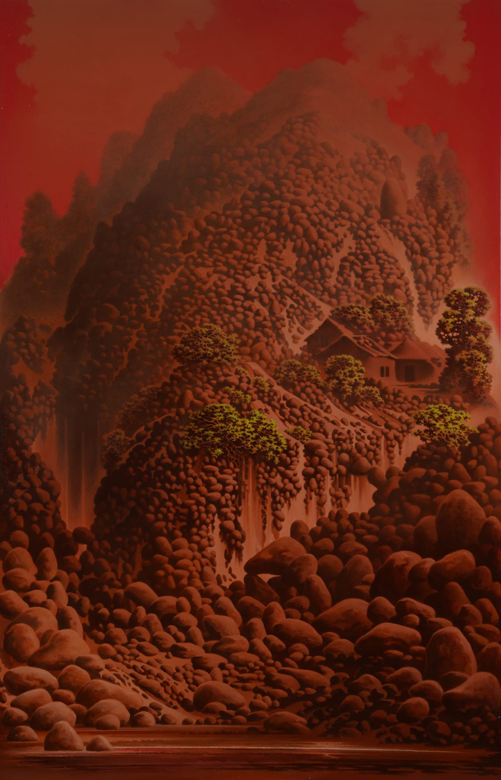 The boulders and russet-colored mountain, wispy clouds or smoke trailing into the sky, and empty house on the ridge, from whose roof trees seem to grow, all add up to an otherworldly landscape. Is it a post-apocalyptic vision, and an acknowledgment that nature has the power to overwhelm its surroundings? Aji’s attention to each boulder heightens the metaphysical nature of this world.