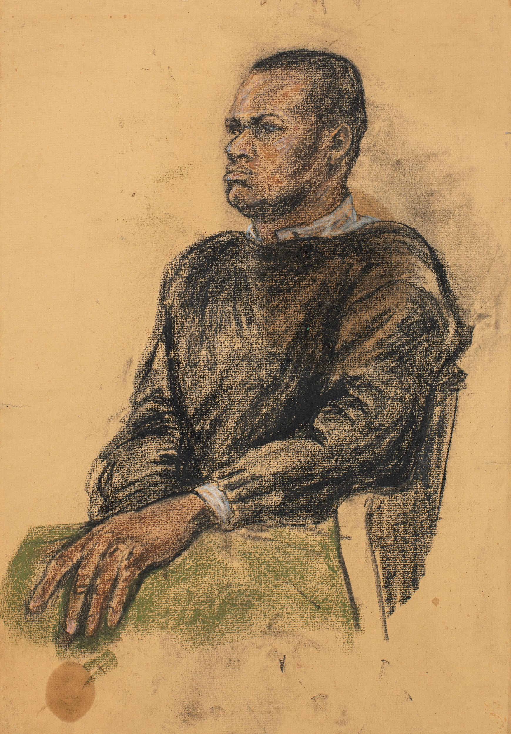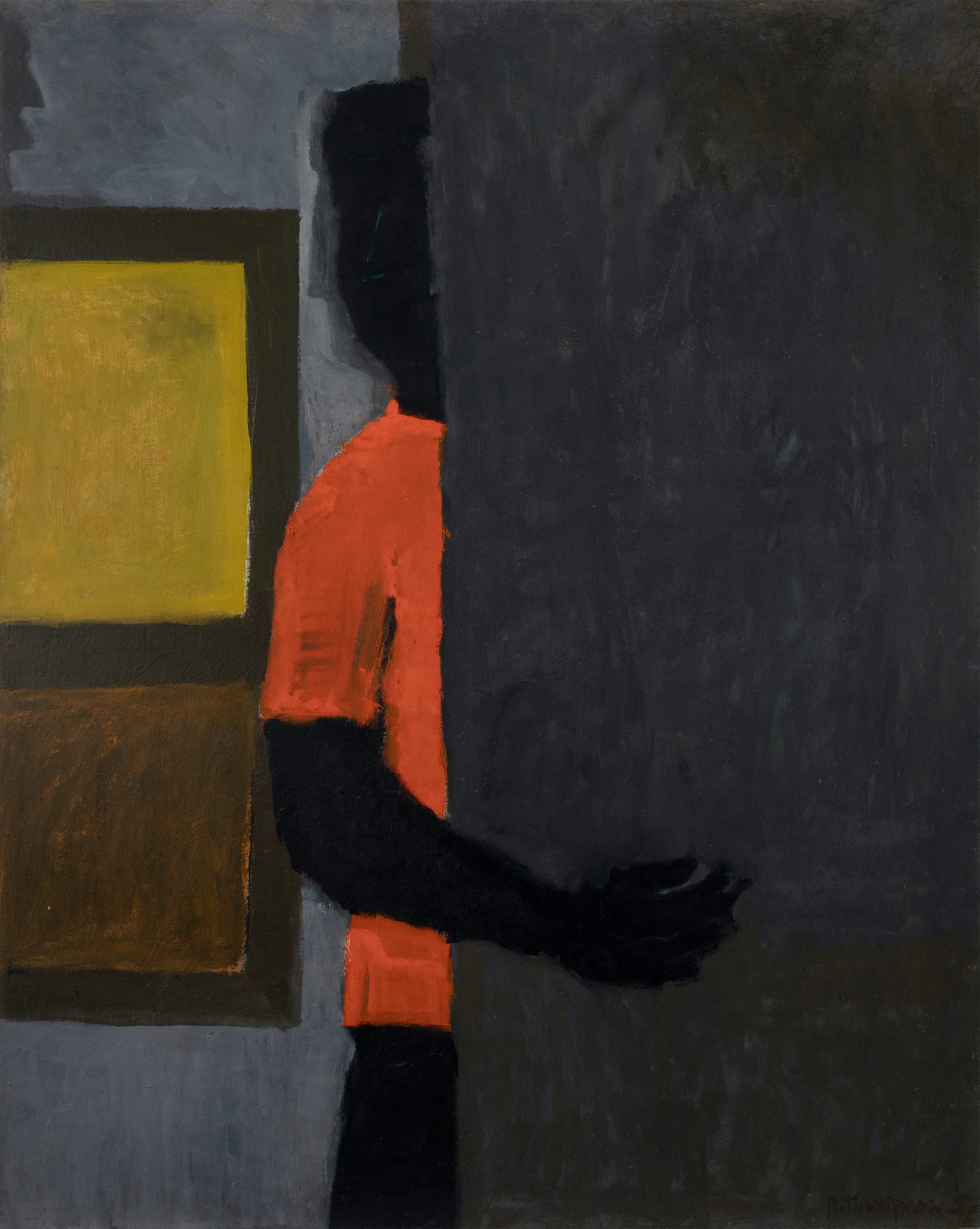 Together, the two shows comprise more than 30 paintings done during every period of Thompson’s short career, along with 11 works on paper (the Michael Rosenfeld Gallery show also includes notebooks, letters, and photographs). If we begin with “Fearful Insider #2” (1958) and the pastel drawing “Self-Portrait” (c. 1958–59), and then consider what changes in “Black Monster” (1959) and “Le Poignarder (the Stab)” (1959) (all at Michael Rosenfeld), after he gets to Provincetown and New York, we can see how quickly and smoothly he moves away from realism, while absorbing and transforming the motif of the anonymous, behatted city dweller from Lester Johnson. Rather than appearing derivative or appropriative, Thompson seems supremely confident. He is sure that he can make something with which he engages into his own, and he is not wrong.