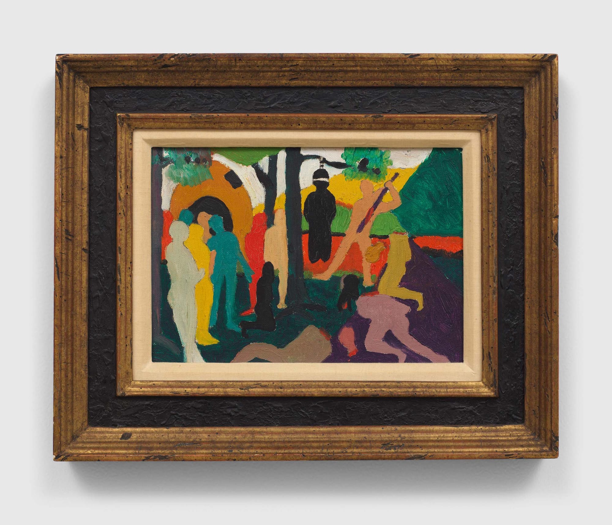 A Black man born in Louisville, Kentucky, during segregation, Thompson’s desire for artistic independence is one of his greatest gifts to future generations of artists, no matter their color, gender, or sexuality. It is a gift that cannot be separated from his opaque figurative paintings populated by featureless silhouettes of humans and animals, depicted in saturated colors and inhabiting an Arcadian landscape. This world seldom comments directly on the legacy of segregation, but never ignores it. Groups of featureless figures are rarely the same color in a Thompson painting, but they are not always hostile to each other — a vision that anticipates Nicole Eisenman’s celebratory 1990s paintings of Brooklyn beer gardens.