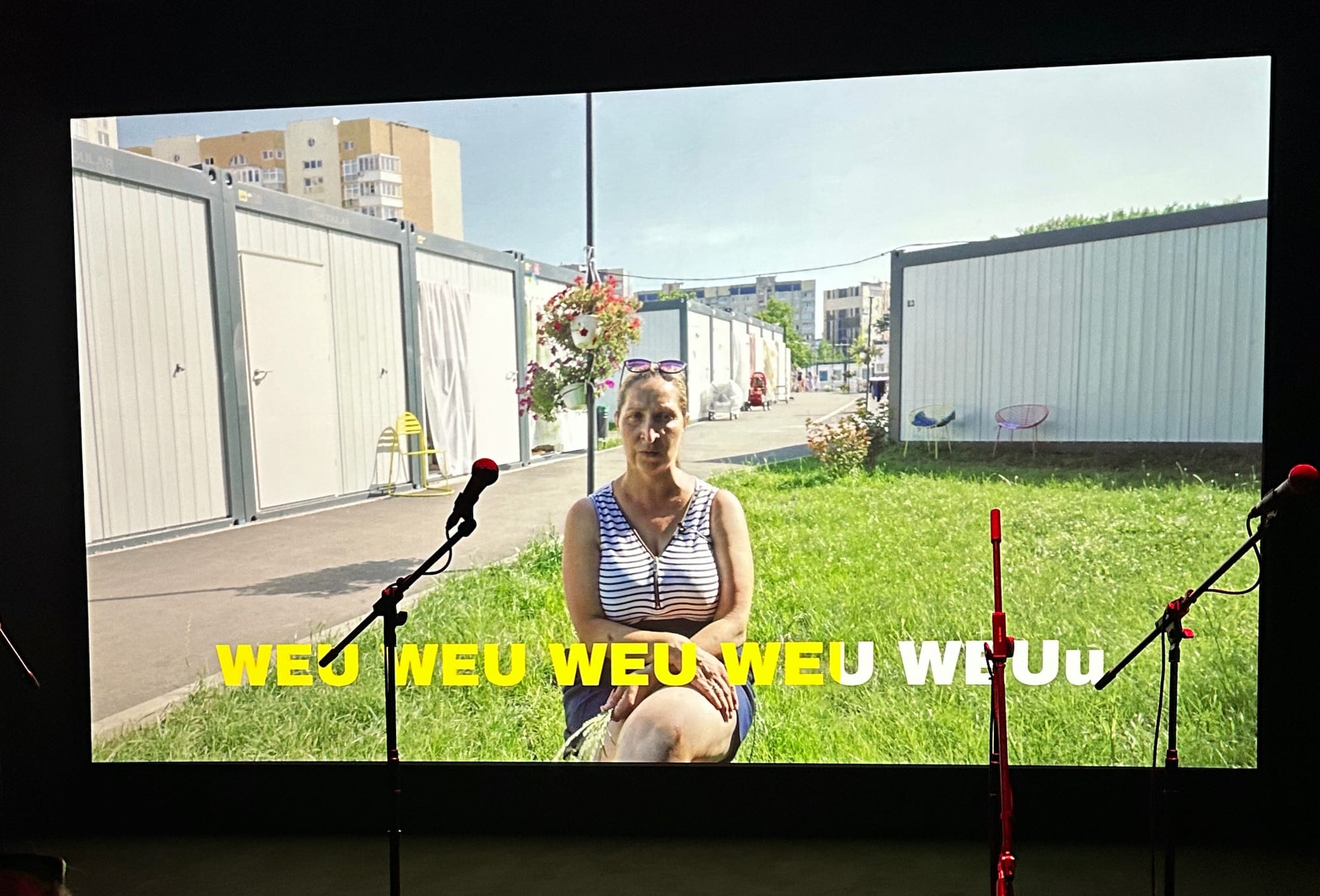 After reciting the sounds twice, the refugees calmly instruct viewers to “repeat after me,” then silently mouth them. Viewers are invited to participate from their seats, standing, or karaoke-style, using microphones in front of the two large videos on either side of the pavilion. This makes the war, often remote for many outside Ukraine, suddenly intimate and close — to personally replicate what a Russian missile sounds like, a helicopter, a mortar, a bomb.