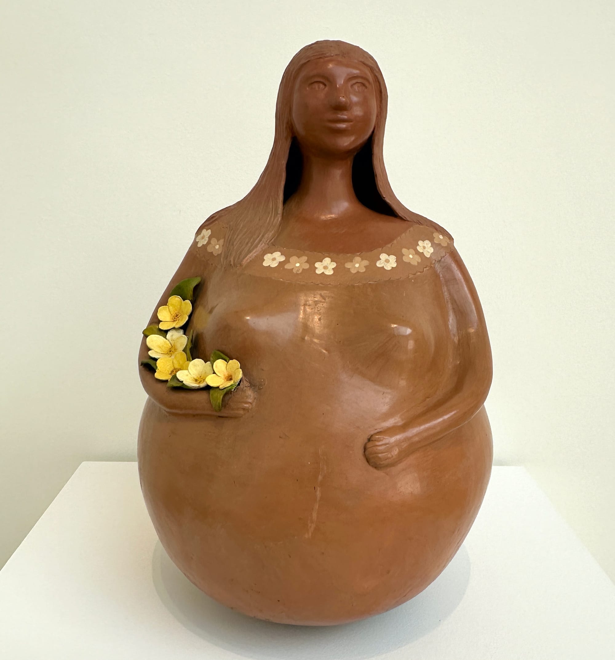 Curated by Esperanza Guevara, Bolivia’s Minister of Cultures, Decolonization and Depatriarchilization (that’s quite a mouthful), “Looking to the Futurepast We Are Treading Forward” (a translation from the Aymara, “Qhip Nayra Uñtasis Sarnaqapxañani”) features artists from Bolivia and several other South American and Latin American countries and seems hastily cobbled together without a coherent focus. It includes a small clay female figure by Bolivian Olga Rivera Diez (from the ministry’s holdings); sumi ink on rice paper drawings by Salvadoran Ronald Morán that ominously resemble razor wire; and two vibrant acrylic paintings by Indigenous Panamanian Oswaldo De León Kantule.