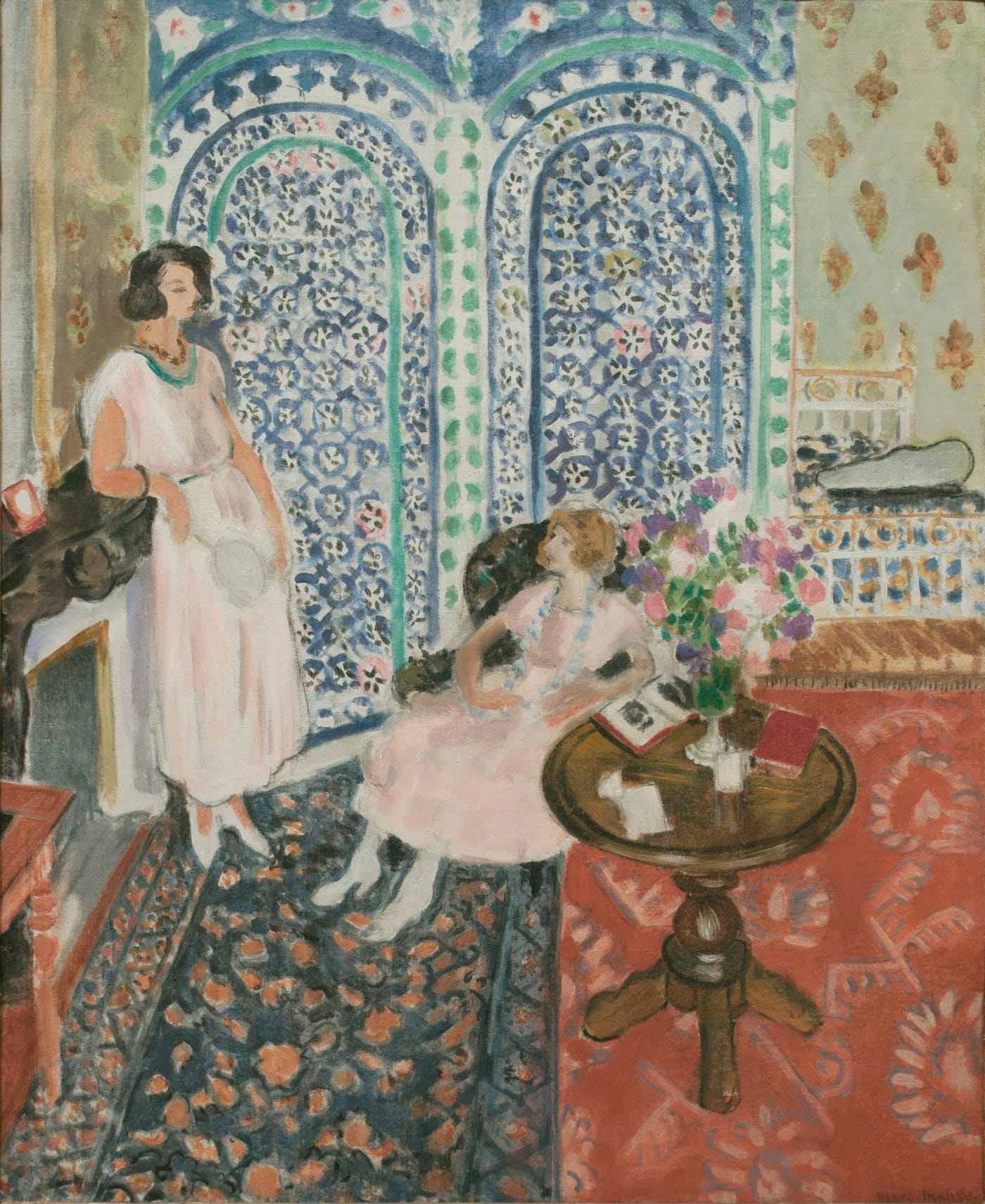 In “The Moorish Screen” (1921), Matisse places a blue-green haiti in the room’s corner, hiding the juncture where two walls meet. Doing this envelopes the two women, dressed in pale, simple frocks, in a rich collage of patterns and jeweled colors. The eye normally tracks towards human figures, but here it’s drawn to the room’s lively décor where it spins before going towards the women.