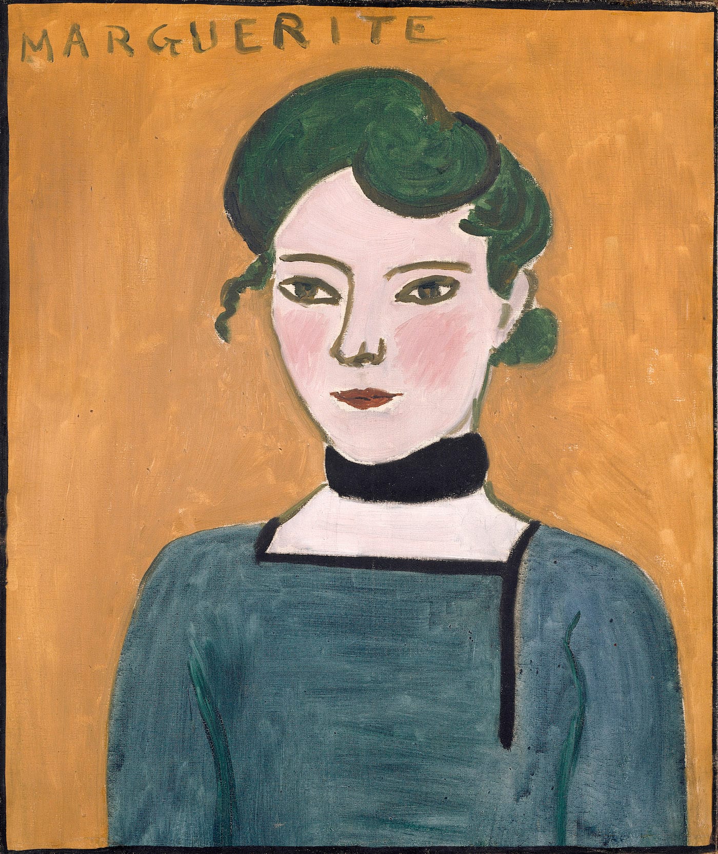 The tribal sculptures also inspired Matisse to reinterpret portraits. In painting his 13-year-old daughter, “Marguerite” (1906-07), he wanted to evoke the emotions of innocence and childhood. So he created her portrait with the simplicity of a child’s painting with flattened features, minimal details, and even what seems like a mistake — a profile nose on a frontal face. Even the letters of Marguerite’s name across the top are scrawled as though an inexperienced hand drew them.