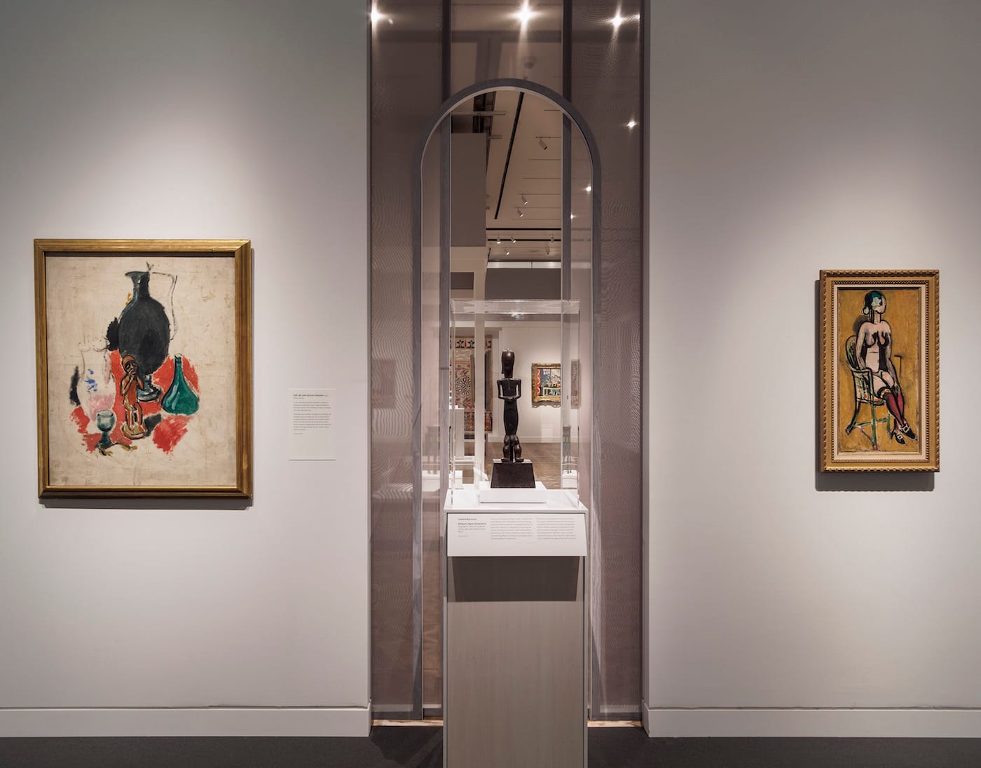 On his way to Gertrude Stein’s house in 1906, he stopped in a little Parisian junk shop and purchased a hand-carved wooden Vili figure, a tourist reproduction of those used in Congolese healing and fertility rites. He and Picasso were both drawn to its expressive language. That carving appears in Matisse’s 1907 painting “Still Life with African Statuette,” and, for the first time, the painting and object are displayed together.
