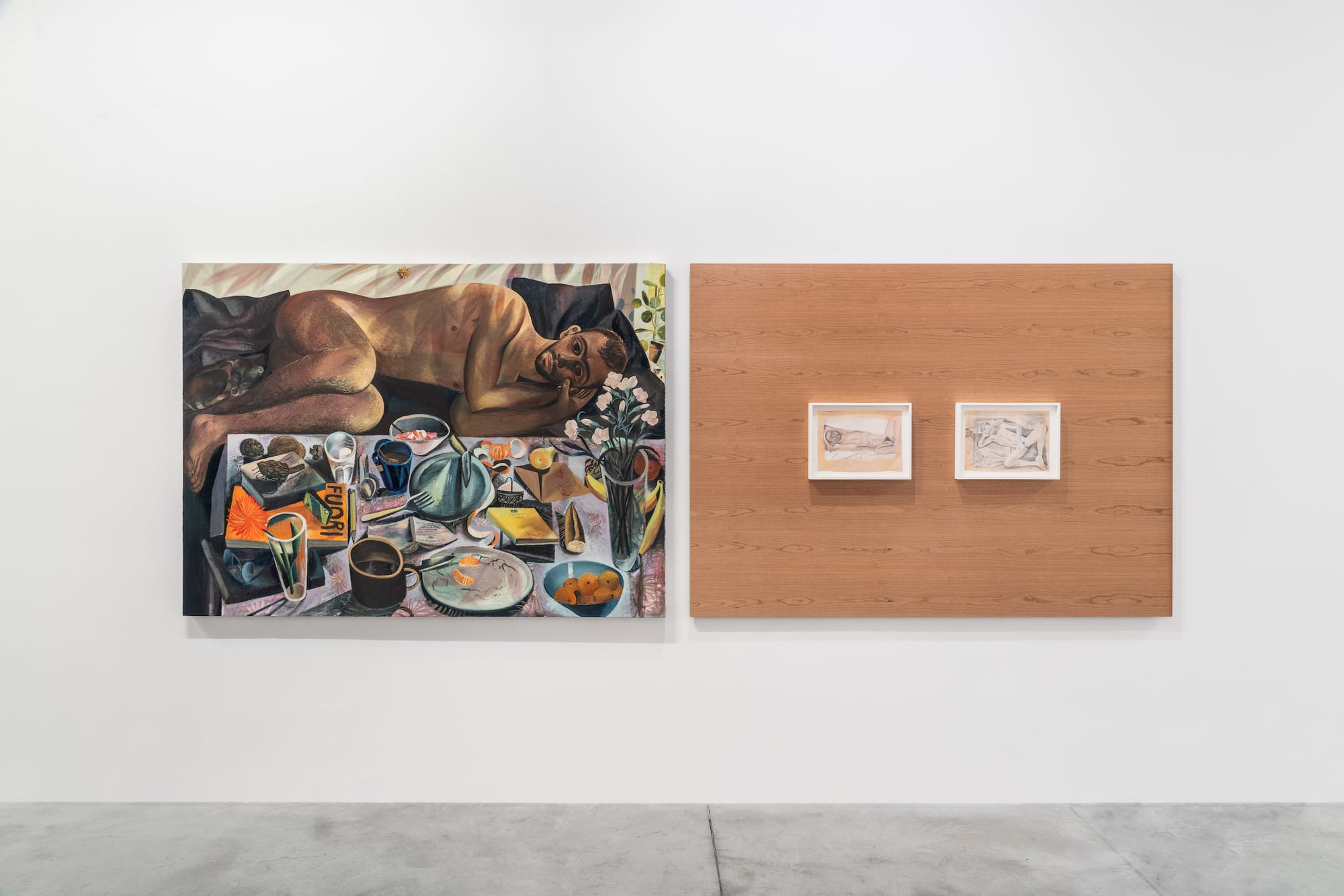 Many pieces reflect intimate moments between lovers (invariably young, taut, dark-haired, and heavy-browed, some recognizably Fratino himself); others revel in quotidian pleasures. In “Four Poster Bed” (2021), two nude men sleep in a bath of light on the titular bed, sprawled over each other in an intriguing drapery of sheets. There are wilted hydrangeas in a kitchen sink (“Hydrangea aspera, kitchen sink,” 2024), a reclining nude lover near a messy table (2022's “You and your things” — Fratino’s many post-meal tables are less memento mori than evidence of enjoyment and satiety). The canvases are dense with references to cinema and literature: tucked within the still lifes, for example, are the covers of books by 20th-century Italian queer writers including Sandro Penna and Mario Miele. In tiny clues across many paintings, the artist outs himself as an avid reader, and it was intriguing to learn that he, an Italian-American raised in Maryland, recently learned the language of his forbears and has steeped himself in 20th-century Italian culture.