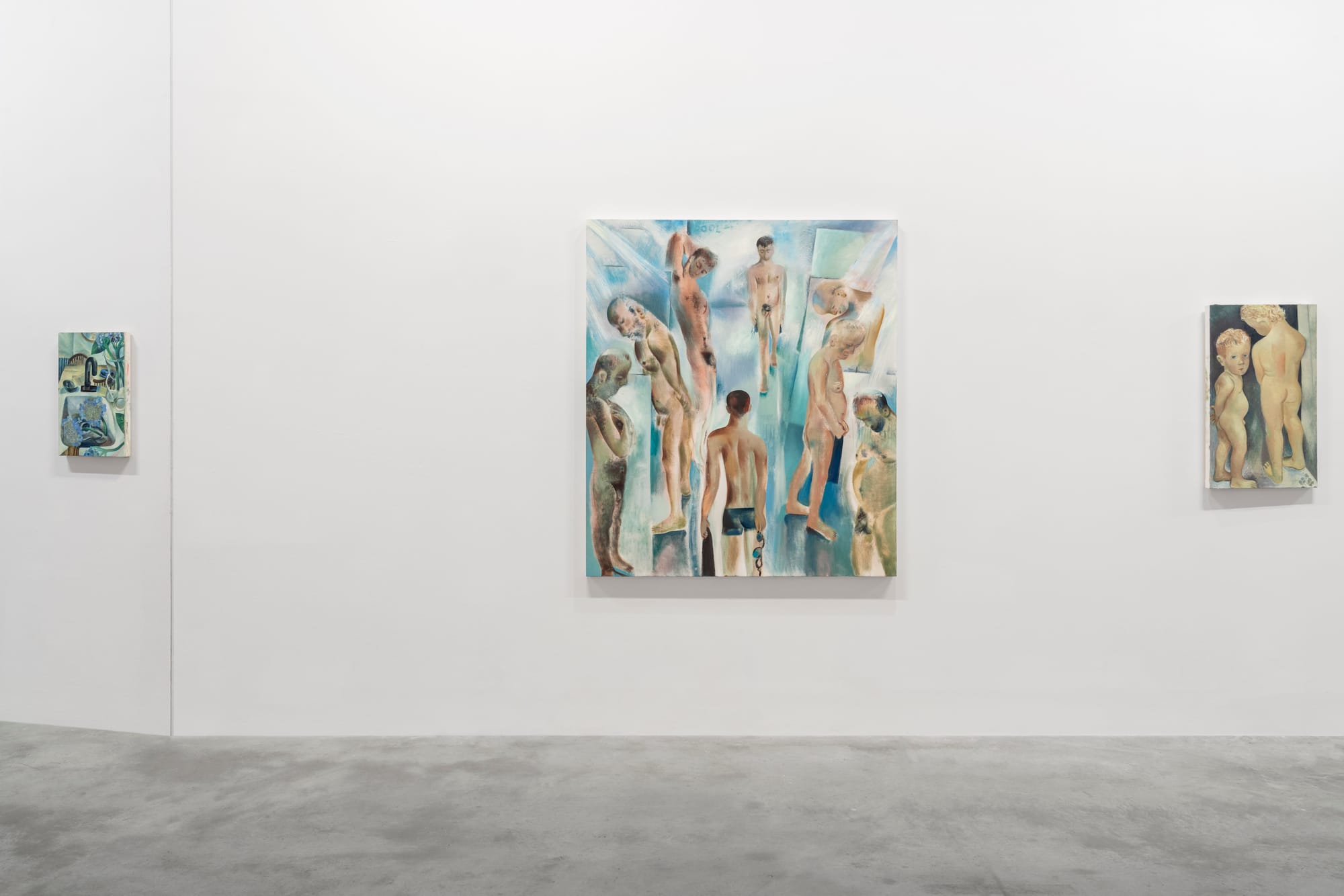 Offsetting the depicted domestic moments are studies of more communal joys: There’s a riotous gaggle of googly-eyed blue fish in a market (“Fish market,” 2020), and dreamy blue seascapes by day and night (“Last swim of the season” and “Moon over the Gulf of Genoa,” both 2020). In“YMCA” (2023), a group of nude men shower together in a steamy room whose overlapping planes echo early Cubism; and in “Arci Bellezza” (2023), the title referring to a popular gay club in Milan, the tightly packed dancers are a rhythm of vertical lines and deep neutral and blue hues.