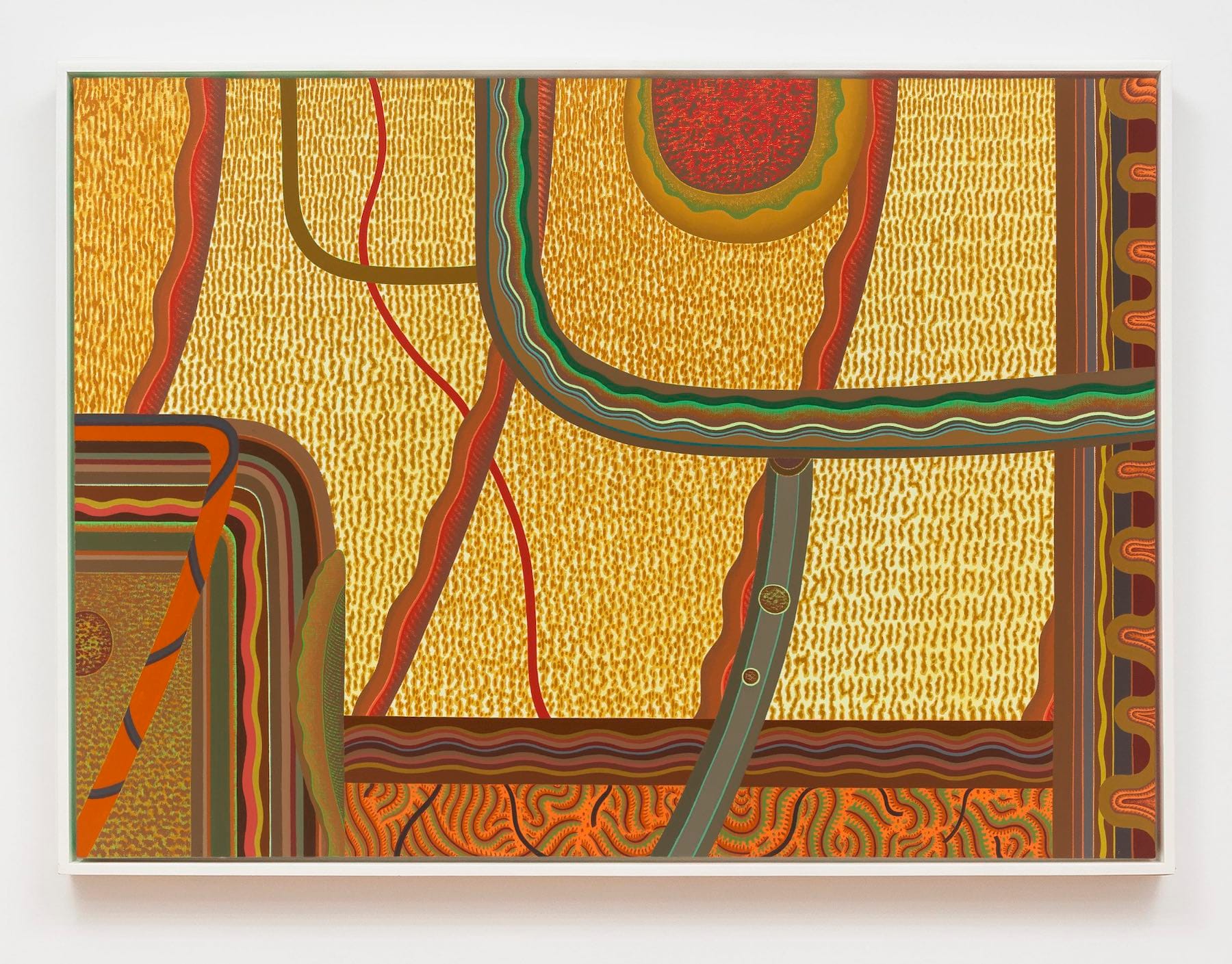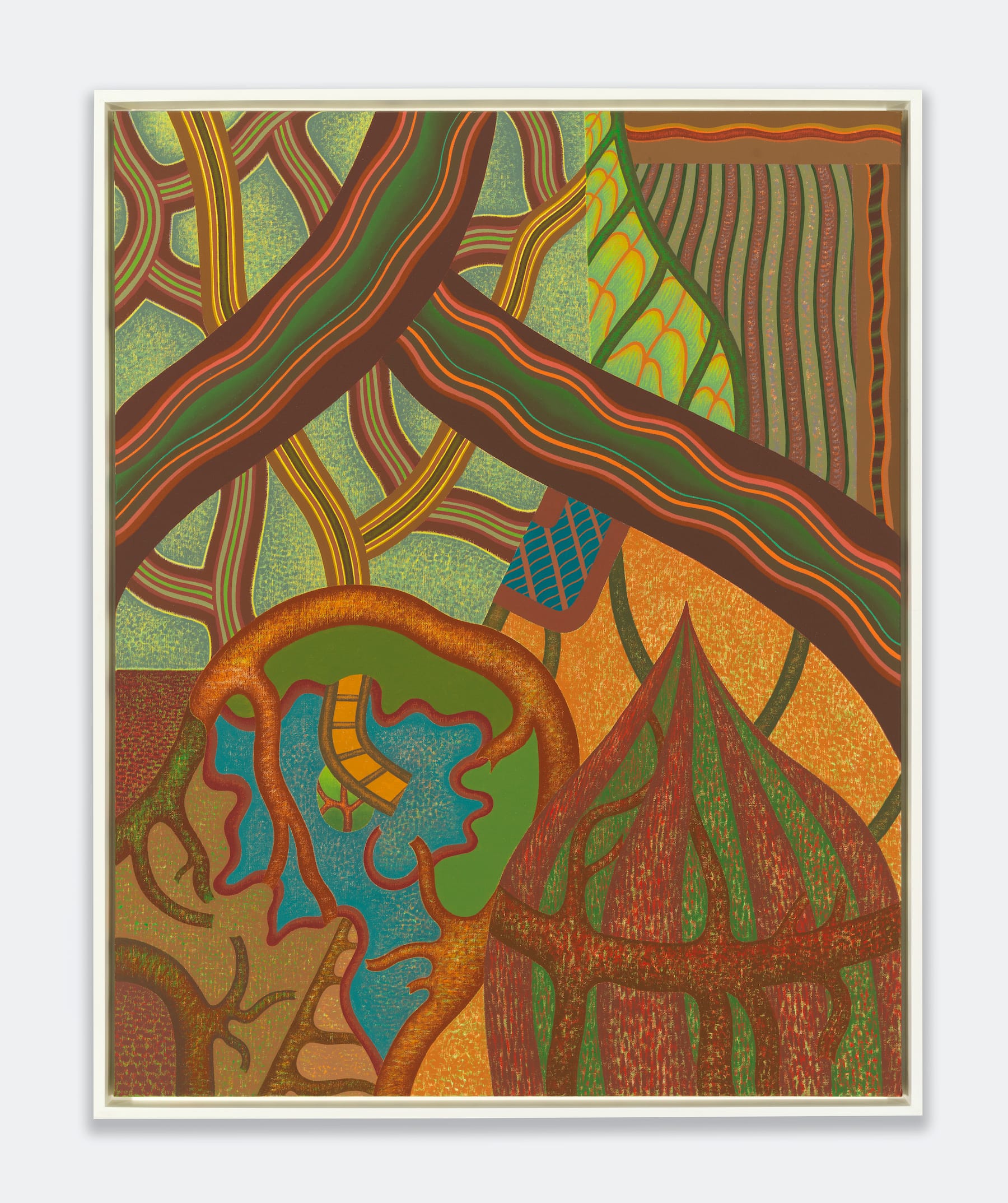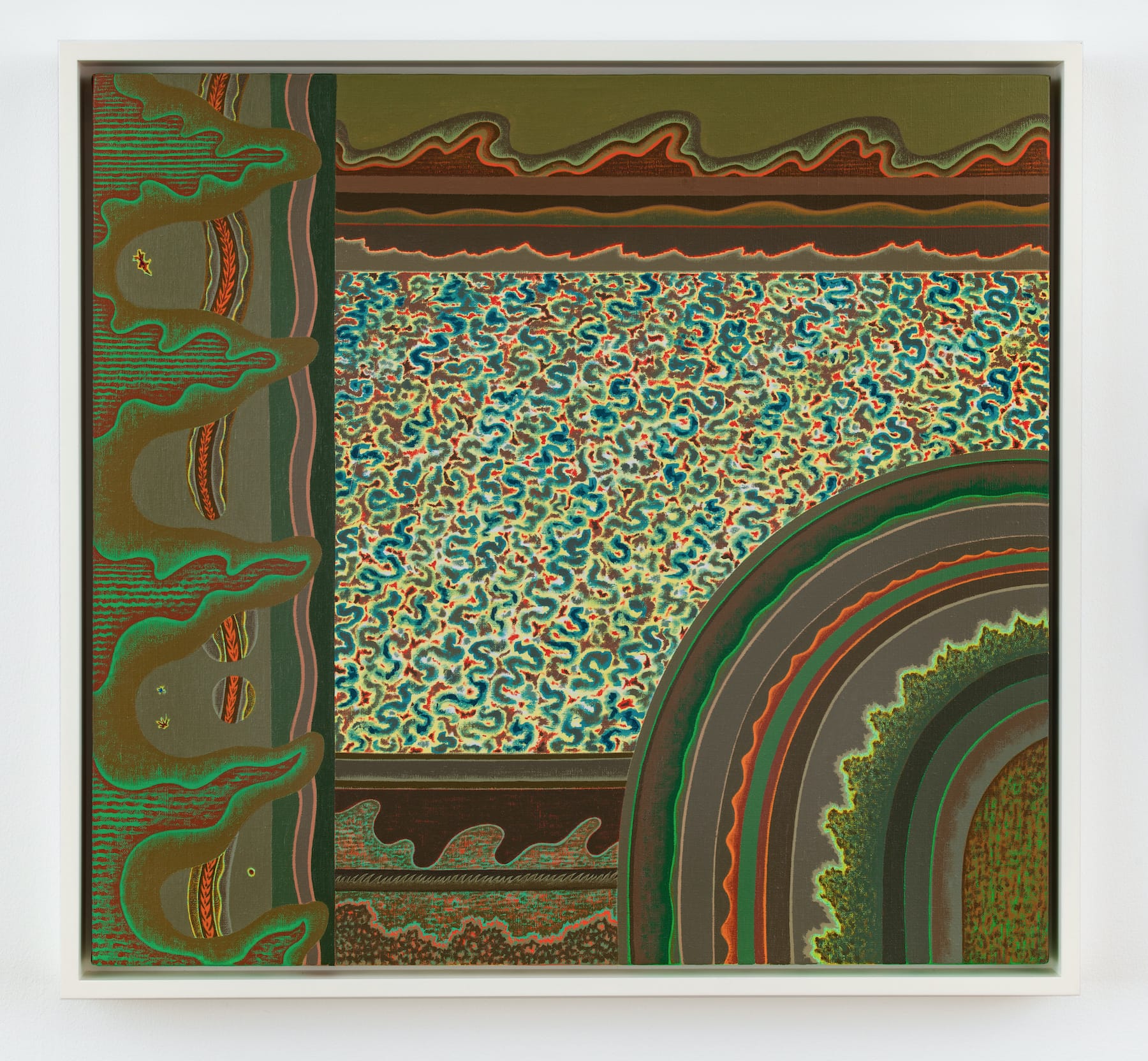 What are we looking at in “Central Forces” (1985) and “State of Flux” (1987)? The titles suggest conditions and change rather than things and stability. While Statsinger’s work brings to mind organic and inorganic specimens seen under a microscope and aerial views, we cannot tell what is benign or malignant, growing or deteriorating. The artist’s recurring use of greens, browns, reds, and oranges suggests nature as the source, but the compositions and forms are not necessarily decipherable. The spatial compression is unsettling and cramped. The cropped edges underscore our inability to get a larger, more comprehensive view. Our thwarted attempts to name and place what we see in a category hints at the multiplicity and endlessness of reality. We tend to think of infinity in expansive terms. Statsinger suggests that the opposite is also true, that the layers of visibility each thing embodies is incessant. That vision of the natural world is unlike that of any other postwar artist.