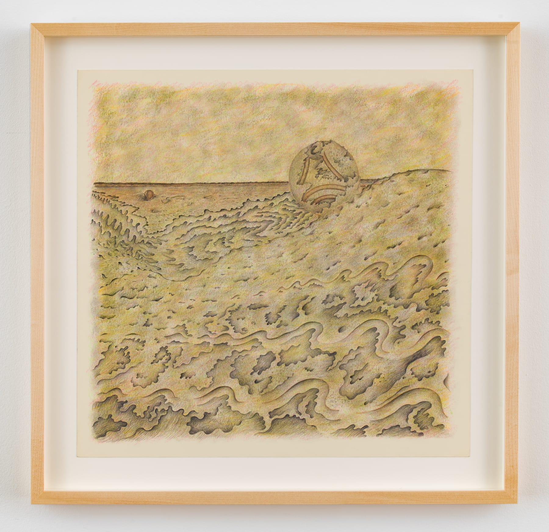 Statsinger, who explored a singular path throughout her career, spent a year in Japan in 1965 (returning again later). I think she began making her best work in the mid-1970s. The eight paintings and five works on paper in Currents were done between 1982 and 1992. If the drawings are any indication of what Statsinger accomplished in this medium, she deserves an entire exhibition devoted to this aspect of her work. Her touch, and the attention that she pays to line, pattern, shading, and closely related tones, makes these works a delight to scrutinize — for instance, one sees a spoon-like shape lying atop a semicircle emerging above what could be a landscape on the lower left of “Conflagrations.” Compositionally, the drawings are more conventional because of the use of a horizon line, as in “Shiftings” (1983). In these drawings, repetition, pattern, and texture evoke things and surfaces. Statsinger has created a world that is simultaneously microscopic and macroscopic, cellular and cosmological; the inexplicable and enigmatic coexist. We have entered a world that is parallel to ours. That it has taken so long for it to be seen and perhaps embraced in New York is not surprising.