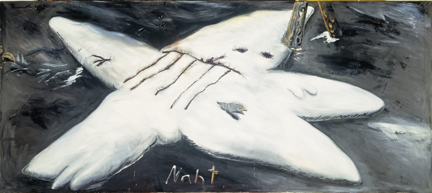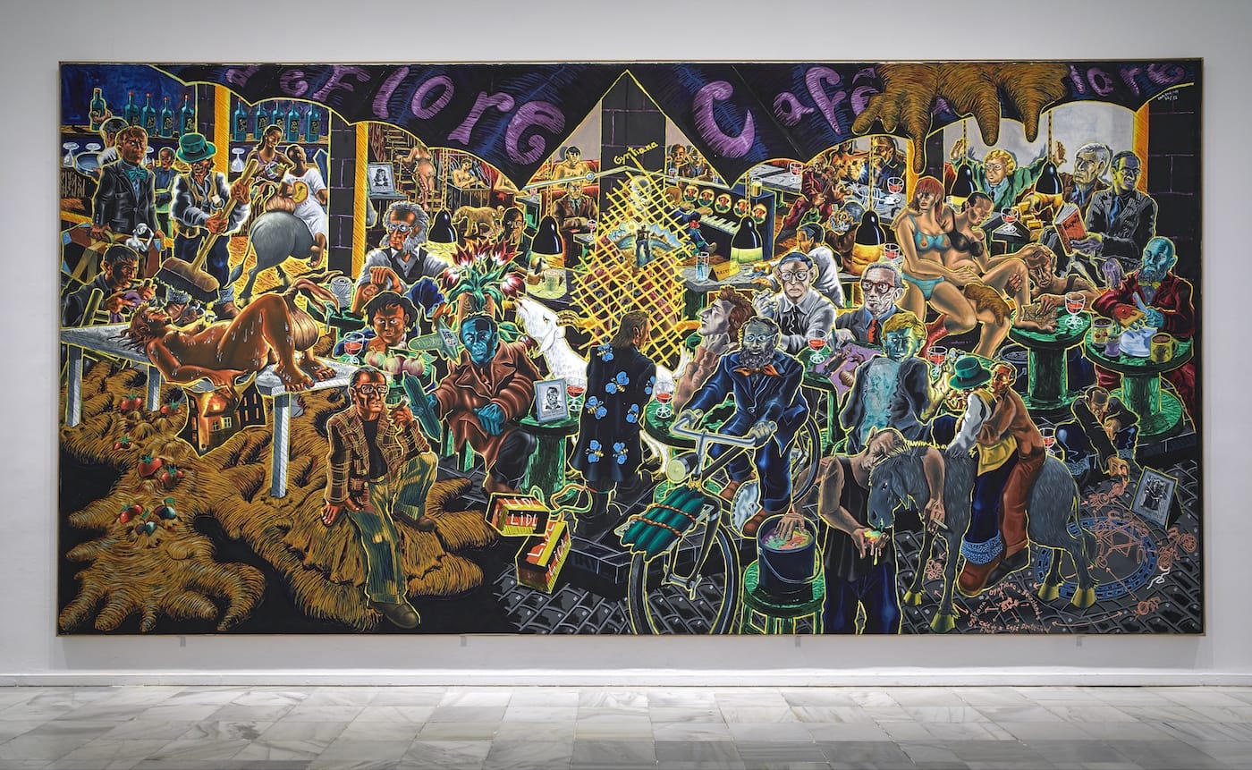 Or consider “In Café Flore (with Max, Otto, Ernst)” (1987) in which Immendorff acts as the waiter, serving Otto Dix, Ernst-Ludwig Kirchner, and Max Beckmann, keeping one drink for himself. The catalogue caption reads, in part: “That a boar grunts under a see-through sheet […] is a minor breach of etiquette, yet we must bear in mind that he tends to be well behaved […] .” That hardly helps. The picture-plus-interpretation is clinically crazy, but, at least for me, it is totally captivating. Perhaps that is the point: Only such an image can truthfully represent our world.