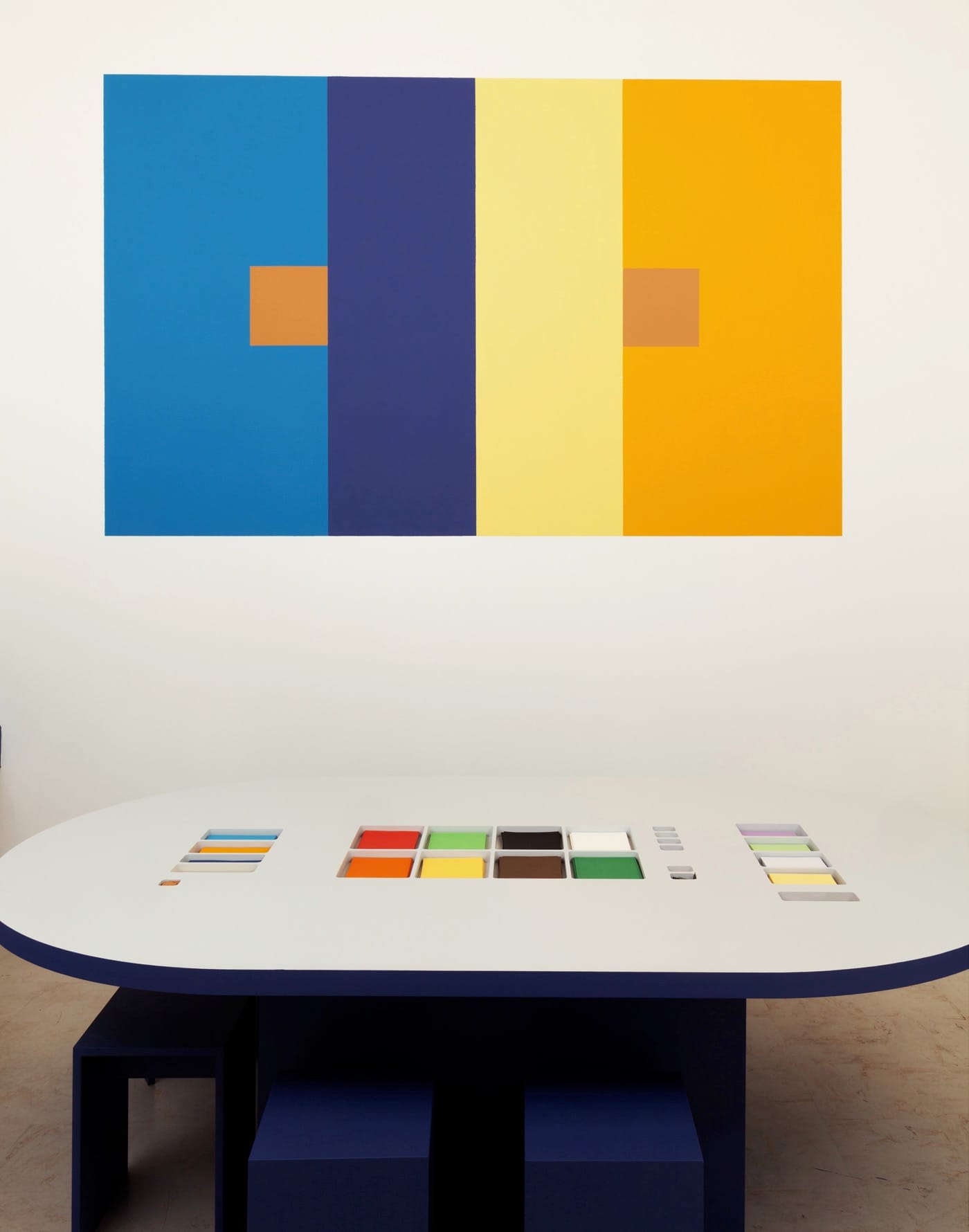 Another enchanting cell formed artist and art theorist Josef Albers’s area based on his book Interaction of Color (published in 1963) in which the Bauhaus professor proposed a series of exercises intended to cultivate an understanding of color interaction and the optical effects of color. On the wall is an exercise from Interaction of Color where the two small central squares of the composition seem to be of two different colors, but they are exactly the same. The context changes our perception of them.