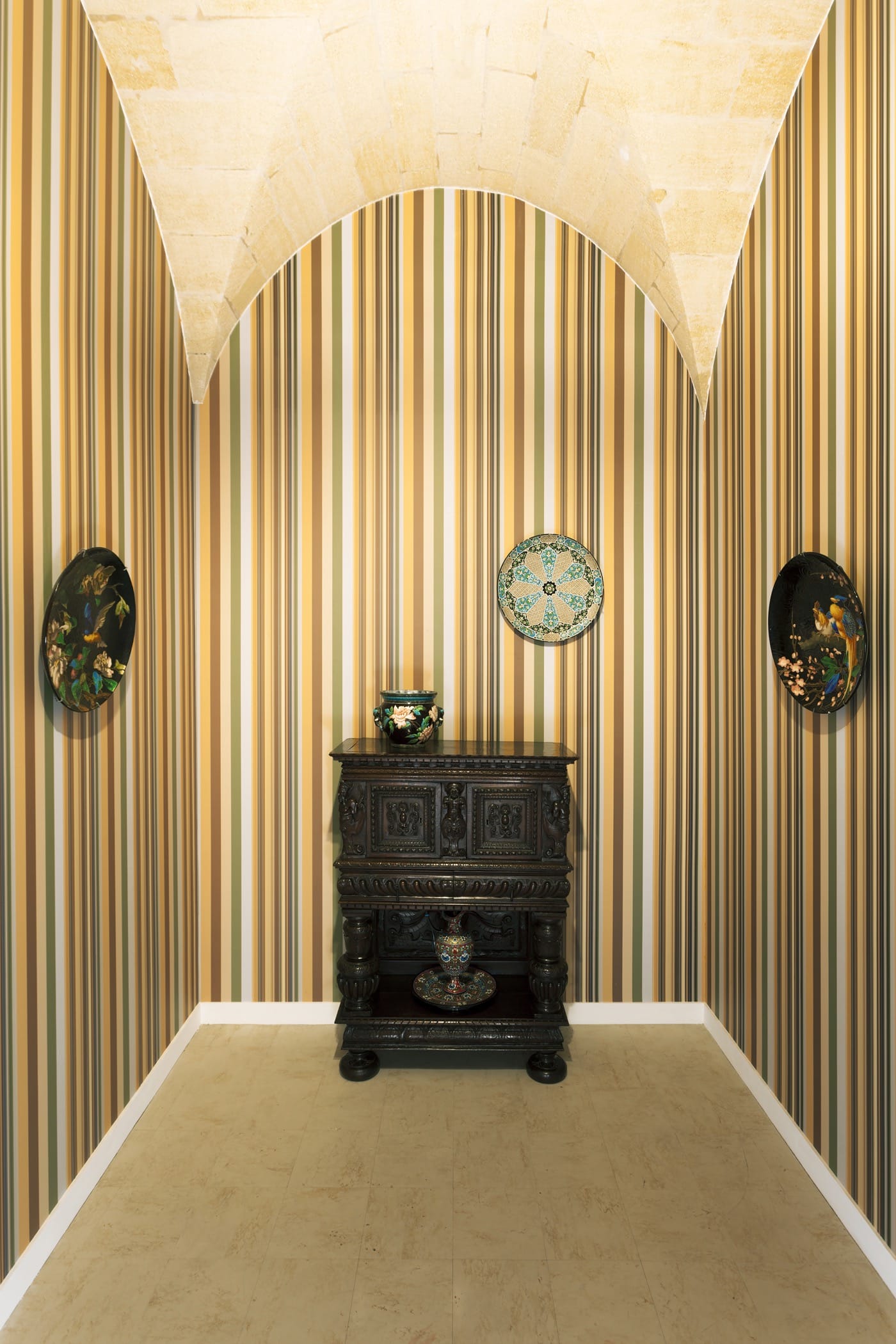 Curated by Constance Rubini and handsomely devised by French designer Pierre Charpin, Oh Couleurs! is divided into two buildings: the 18th-century Hôtel de Lalande that was built for the parliamentary councilor Pierre de Raymond de Lalande, and a newly renovated 19th-century prison where criminals and sailors and prostitutes were imprisoned pending a verdict by the local public prosecutor. The walls were fresh and stunningly painted solid, vivid colors, but Etienne Tornier, the conservation attaché for their 19th- and 20th-century collection, pointed out to me some scratched graffiti on the cell doors that conjured up that less pristine past. Charpin used the small prisoners’ cells most effectively to create color-themed niches, such as the Dutch illustrator and typographer Irma Boom’s “Color DNA based on the city of Bordeaux” (2017) where she created a wallpaper design evoking the colors of Bordeaux within which are placed a 16th-century wood dresser from Bordeaux and three romantic faience pieces made by the company Jules Vieillard & Cie.