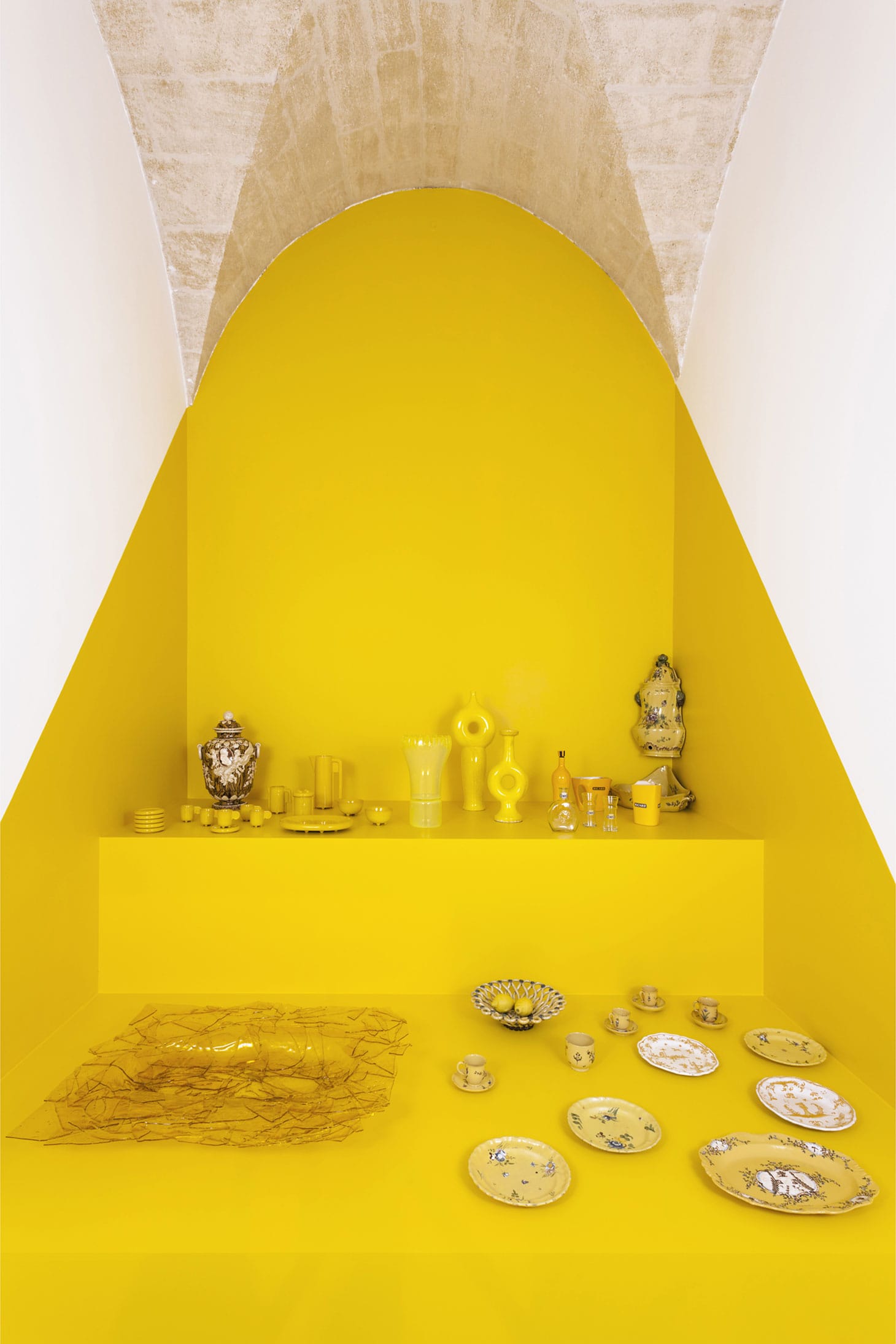 Another cell housed a delightful southern yellow theme announced by a Vincent Van Gogh quote from an 1888 letter to his brother Theo. This bright, buttery cell holds a great many yellow objects that seem to vibrate together in harmony. These include Suzanne Ramié’s brightly yellow, glazed ceramics from the mid-1950s made in Vallauris, pastis-maker Paul Ricard’s yellow marketing products, Gaetano Pesce’s large platter “Old Port Yellow” (1992) and Martin Szekely’s sleek “Cold Yellow Vase” (1988) mixed with 18th-century faiences from Marseille.