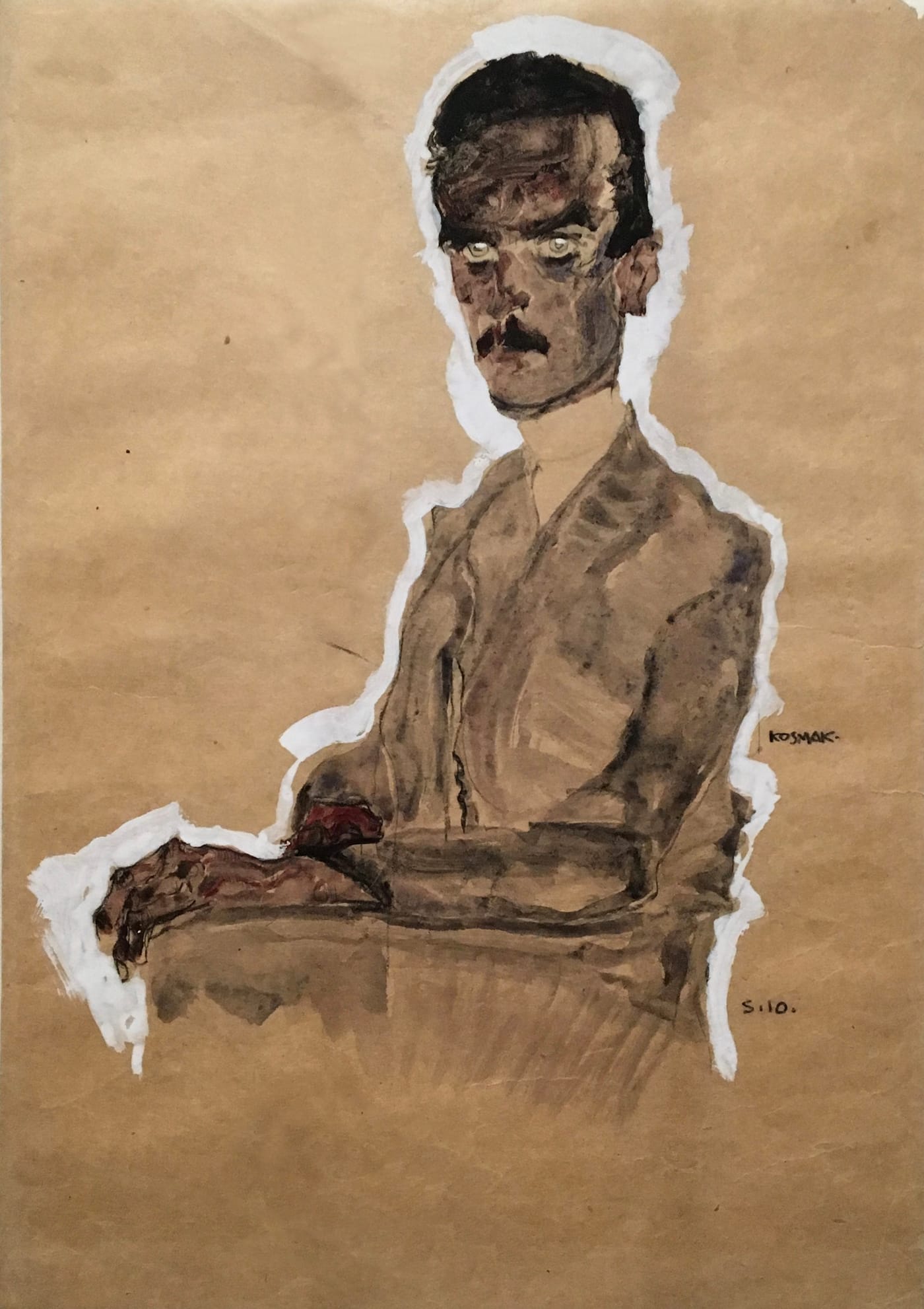 Egon Schiele, “Eduard Kosmack” (1910), black chalk, watercolor, and opaque white, Albertina (all photos by the author for Hyperallergic)