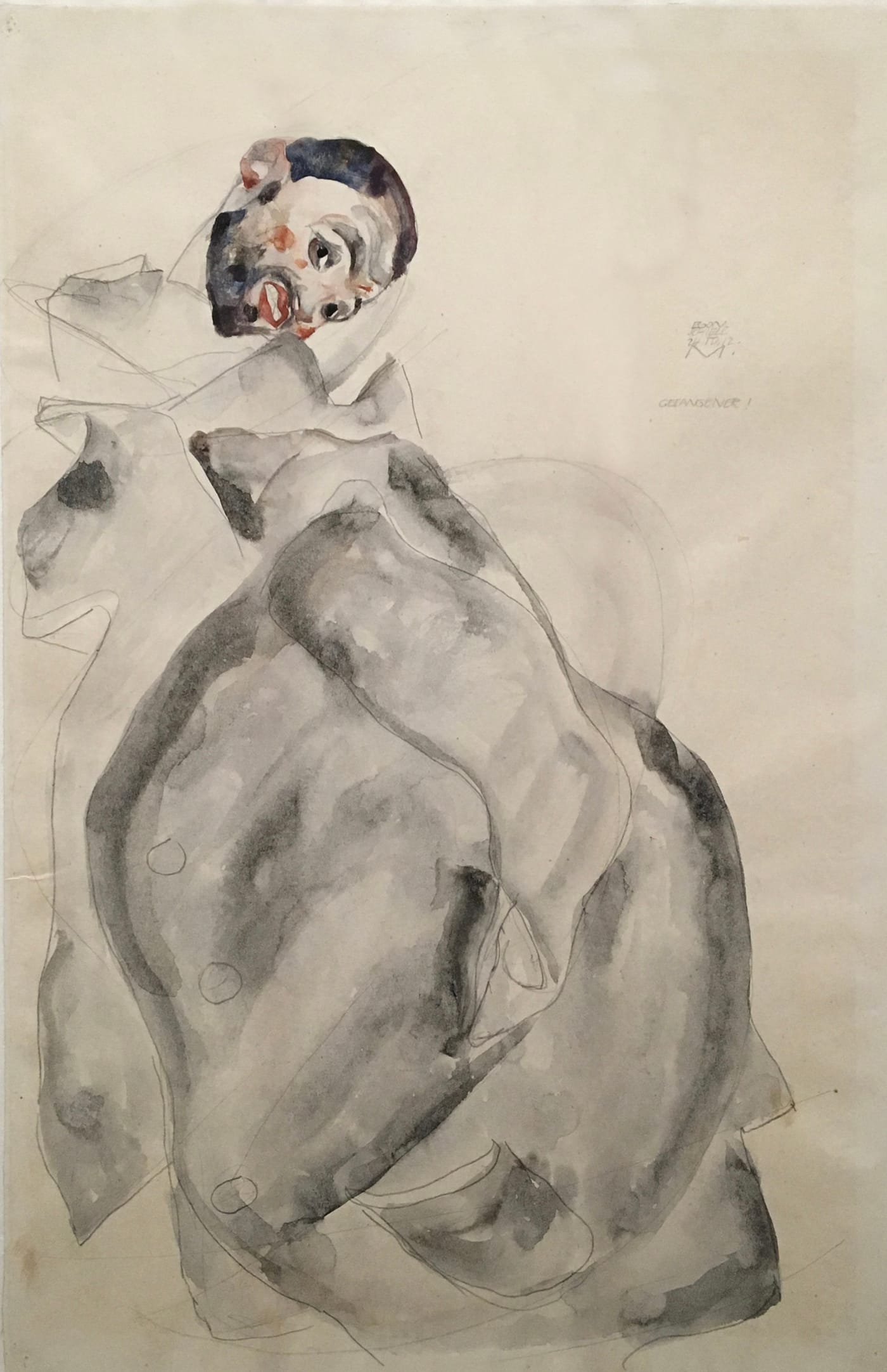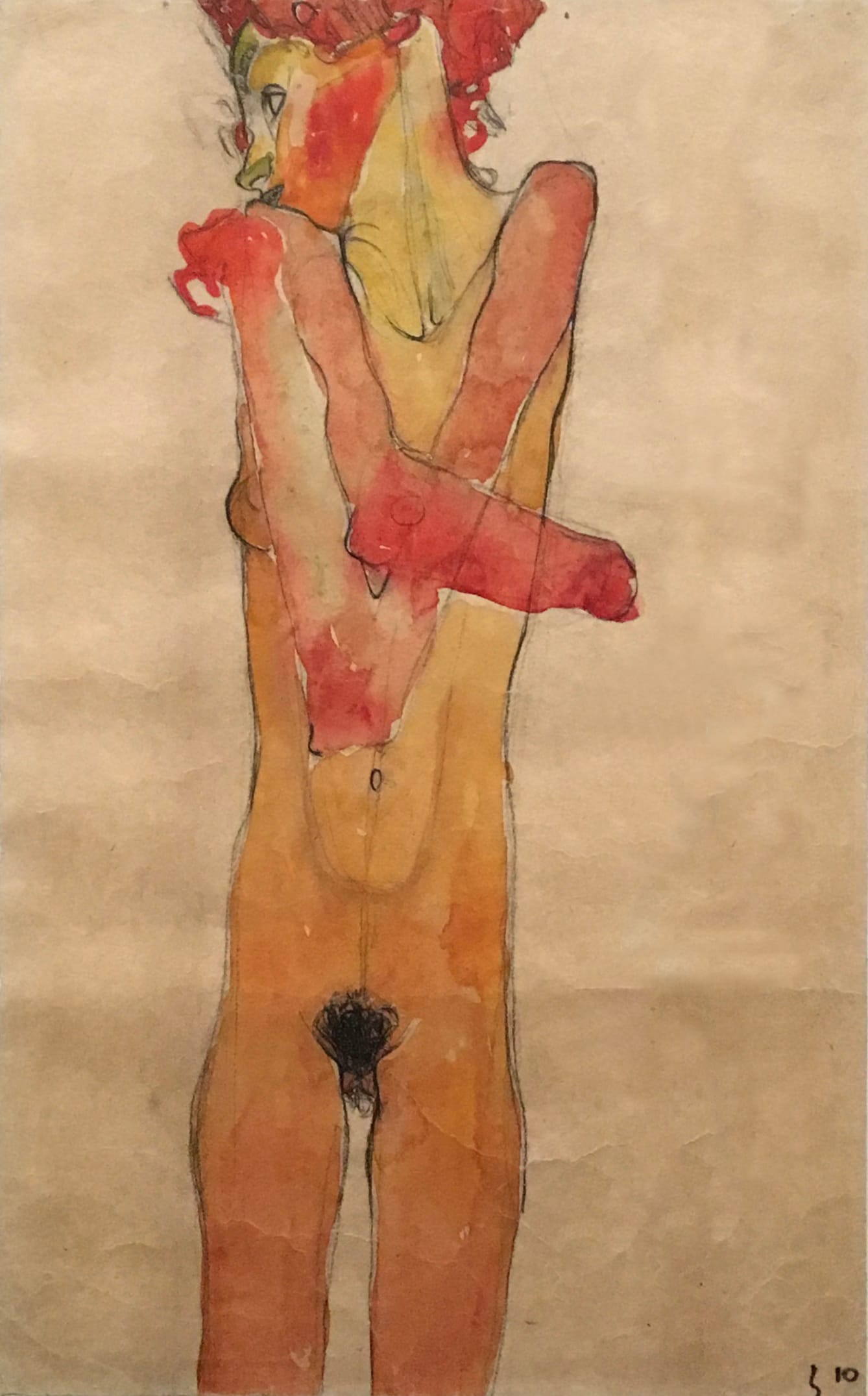 Egon Schiele, “Nude Girl with Folded Arms” (1910), black chalk and watercolor, Albertina