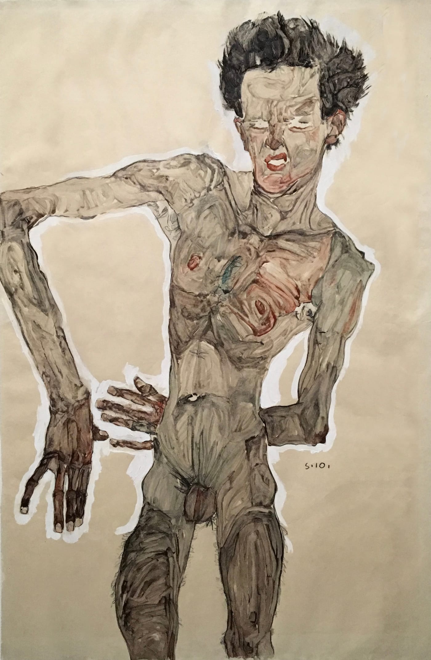 Egon Schiele, “Nude Self-Portrait, Grimacing” (1910), pencil, charcoal, and gouache, Albertina