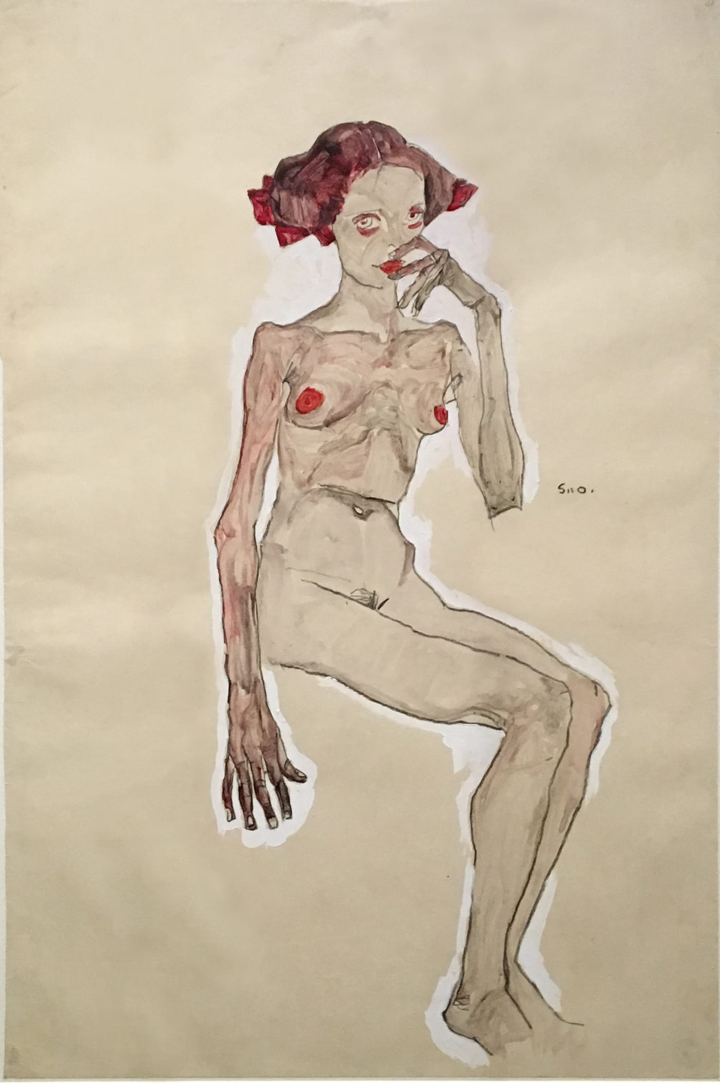Egon Schiele, “Seated Nude Girl” (1910), pencil, chalk, watercolor, and gouache, Albertina