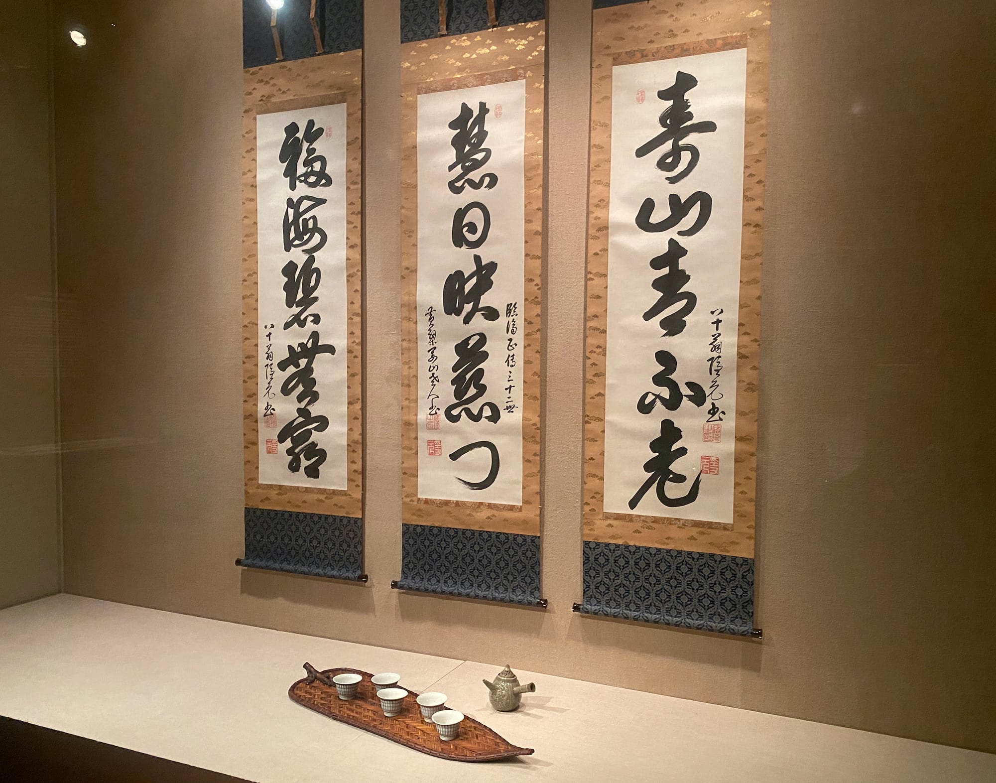 These pieces are part of Tong's exhibition Dialogue, in which poetry and calligraphy fly and merge together. They complement the concurrent show The Three Perfections: Japanese Poetry, Calligraphy, and Painting from the Mary and Cheney Cowles Collection. The latter includes 160 works that contain these three artistic forms, which frequently interweave in East Asian aesthetics.