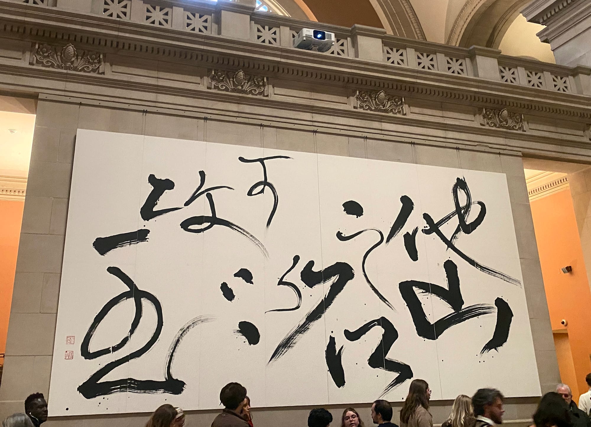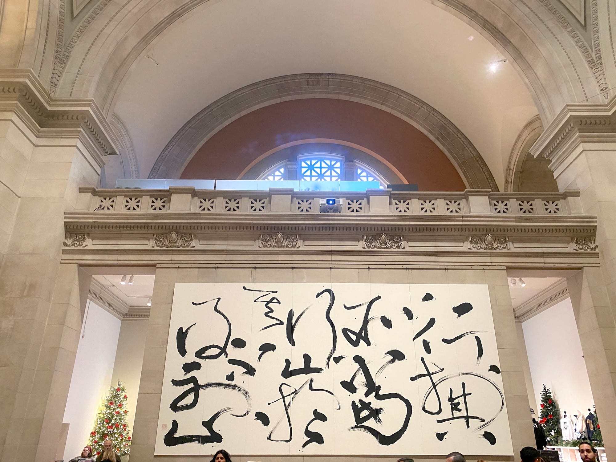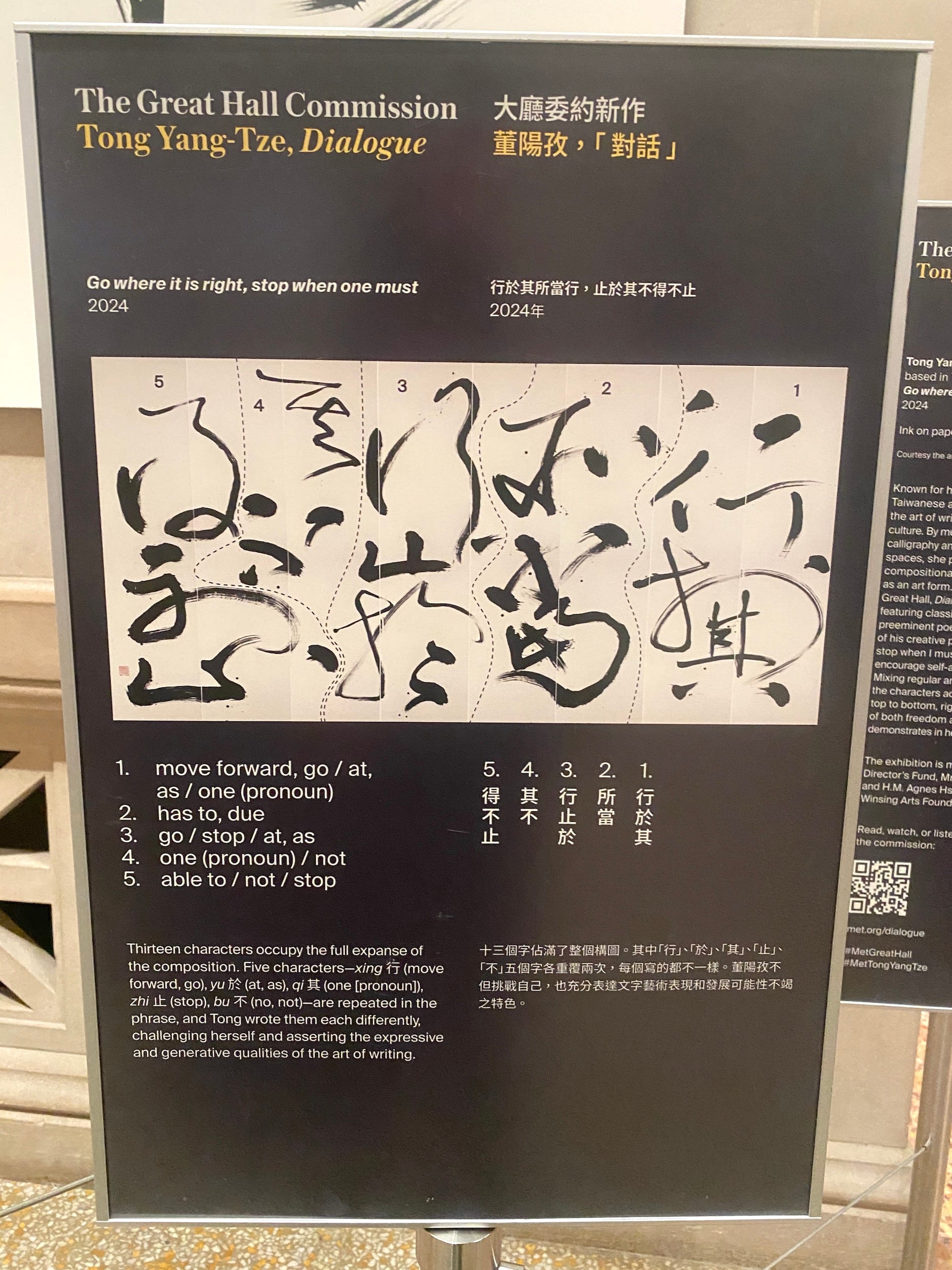 In line for tickets at The Met's Great Hall, I spotted the massive calligraphy of Taiwanese artist Tong Yang-Tze, a 2024 museum commission whose broad brush strokes leap across the canvas. In “Go where it is right, stop when one must” (行於其所當行,止於其不得不止), the character for “move forward or go” (行) appears twice — once with greater legibility in the strokes, as the poem starts, and then once again in a lighter, more abstract style, in the middle of the poem. The work references the Song Dynasty poet Su Shi, whose poem feels apropos for any contemporary creative practice: Move forward with your practice when it feels right, and stop when you need to.