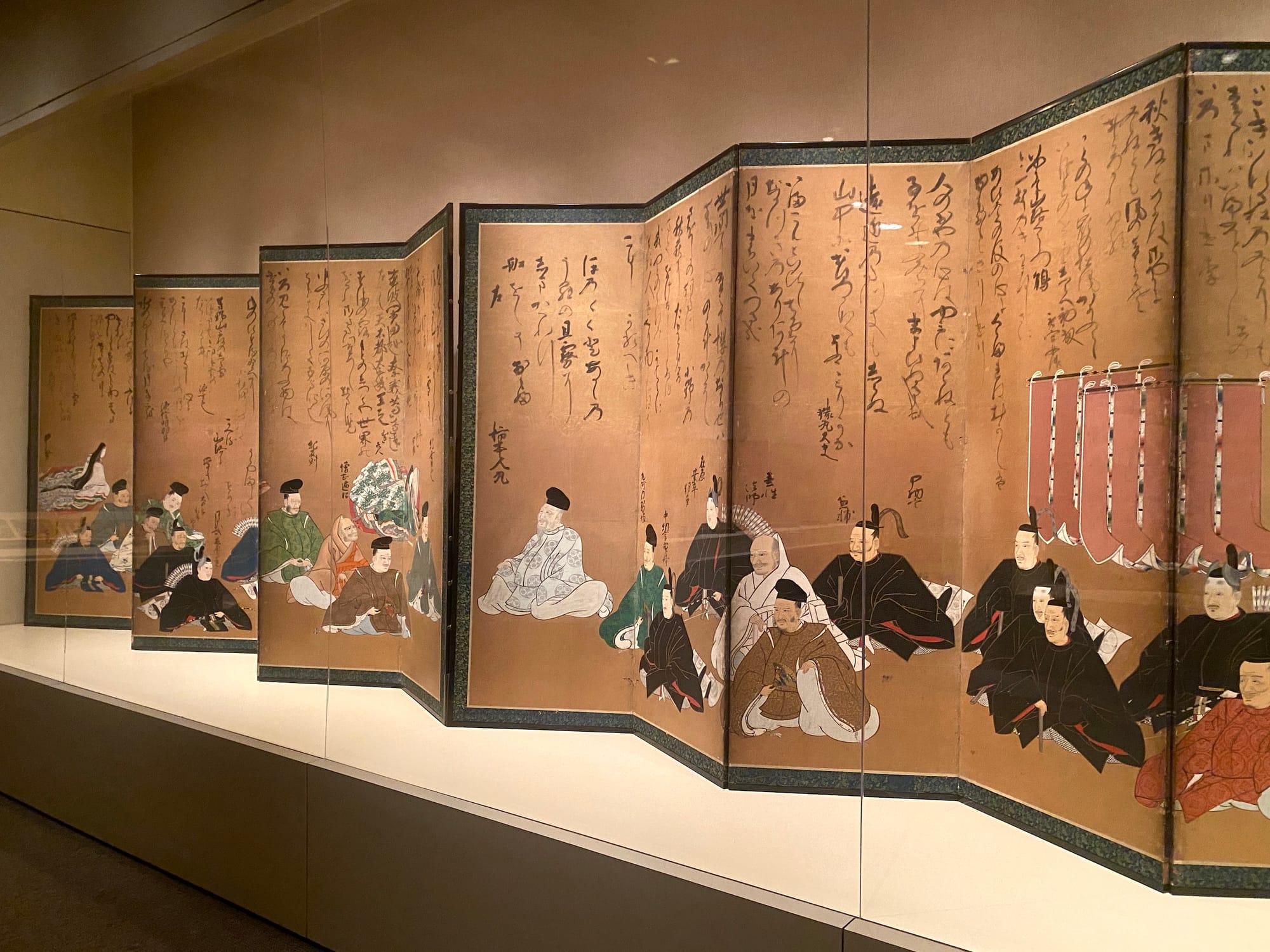 “The Thirty-Six Poetic Immortals” is a gorgeous set of painted screens from the 17th century that portrays courtly poets — only five of them women — deemed important at the time. It’s a good example of the three perfections in one: The painting comes from the Studio of Kano Takanobu, while the calligraphy is by Konoe Nobutada, and the poems include one waka, or court poem, by Ki no Tsurayuki: