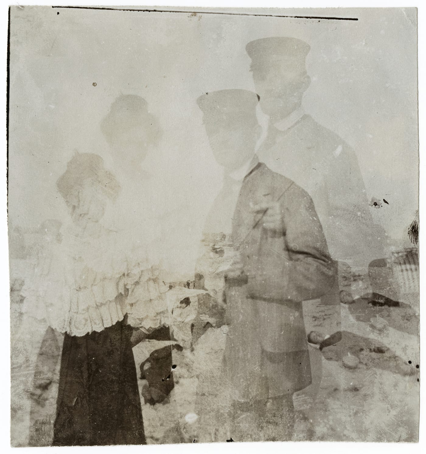 In addition to a fascination with seriality, Munch’s photos demonstrate an interest in the spooky possibilities of photography — the use of technical manipulation to obscure rather than to capture verisimilitude. “Edvard Munch and Rosa Meissner in Warnemünde” (1907), one of a series, shows its subjects overexposed, concealing detail. In addition, the image is doubled, so that the ghosts of its subjects appear to be standing directly behind them.