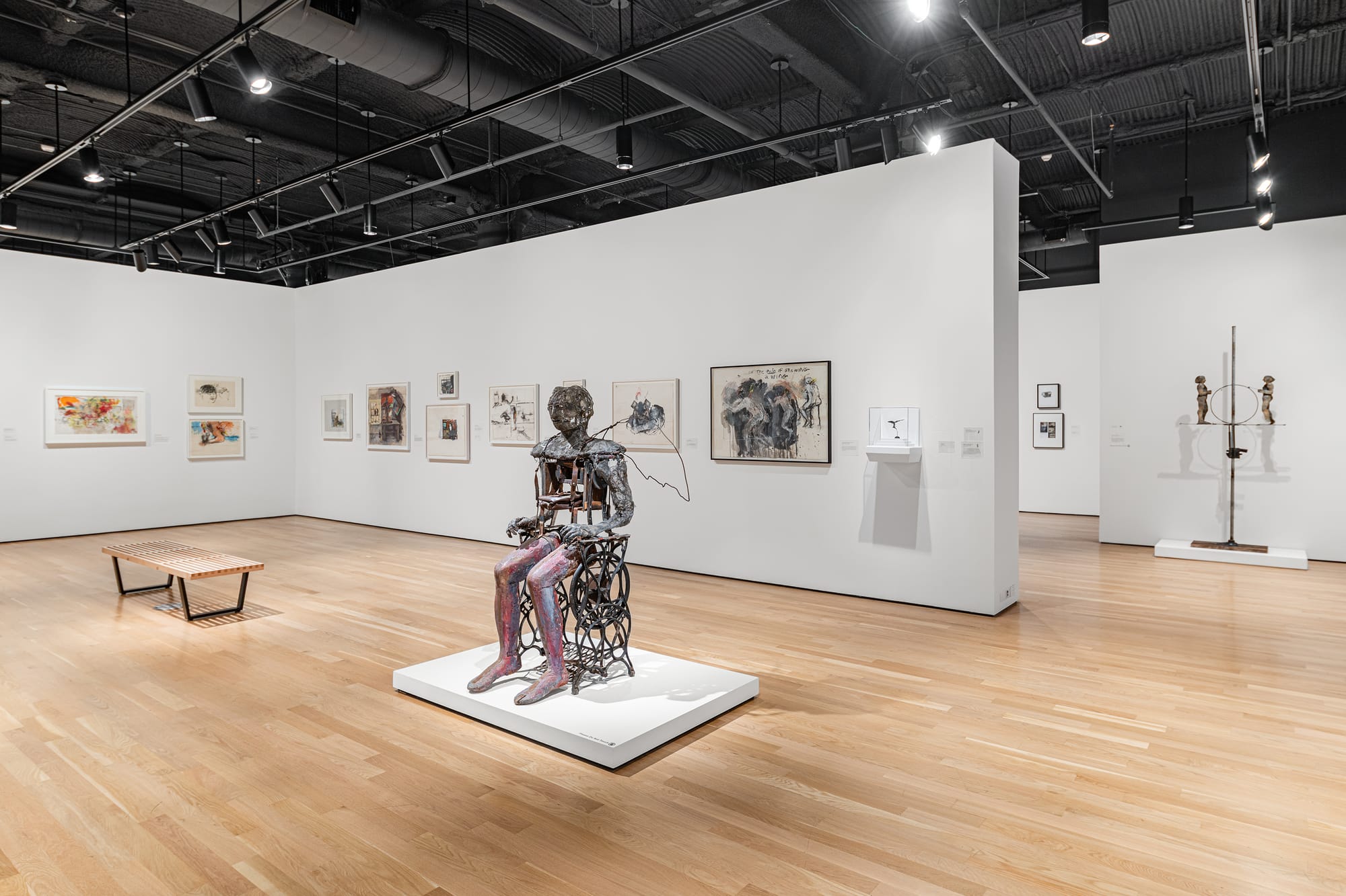 It makes sense, therefore, that Shooting from the Heart, a retrospective of Leaf, who died a little over a year ago at 94, arranges a generous 120 works thematically, rather than chronologically. The exhibition was co-organized by the Addison Gallery of American Art at Phillips Academy in Andover, Massachusetts, where the exhibition debuted, and the Allen Memorial Art Gallery at Oberlin College in Oberlin, Ohio, where it will travel next — both institutions with longstanding relationships to Leaf’s work. It's currently on view at the Grey Art Museum in New York, in the Lower East Side neighborhood, where she resided off and on for many years. As a whole, it captures Leaf’s restless experimentation across media and the unceasing movement and performance-like nature of her works, including a carnivalesque playfulness. Yet it misses something of the cluttered chaos of her working process — also the most fitting environment to discover her works.