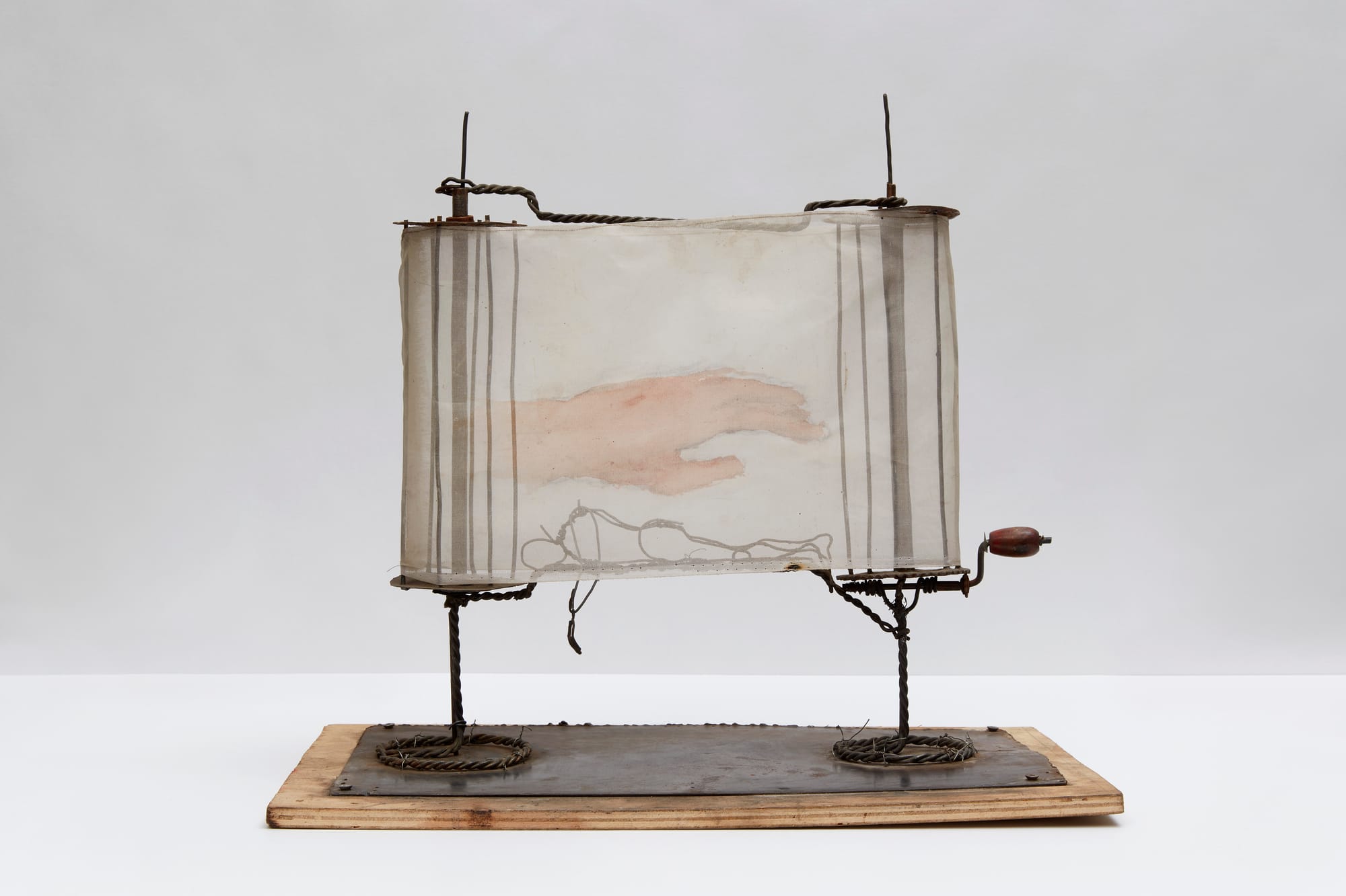 Indeed, Leaf collected treadles to incorporate into her work. Among the most wonderful of these is “Untitled (Theater)” (2011), in which two small figures stand in a large freestanding shadow box that conjures the dreamlike settings of an empty hall or the inside of a covered wagon. You can almost feel the winds of memory echoing within. Such works are personal and interactive — it made me wish the show included options to operate the little machines or to experience them in the context of a world as chaotic as her studios, surely the most ideal way to discover them. Alas, a retrospective tends to tidy things up a bit too much, though upcoming public programs will presumably involve activation of selected works. (That was how Pirelli HangarBicocca in Milan handled a Tinguely exhibition last year.) No matter: These are works designed, at the very least, to spur a kinetic response inside the viewer’s head — that outside-in and inside-out relationship that was key to her life’s work.