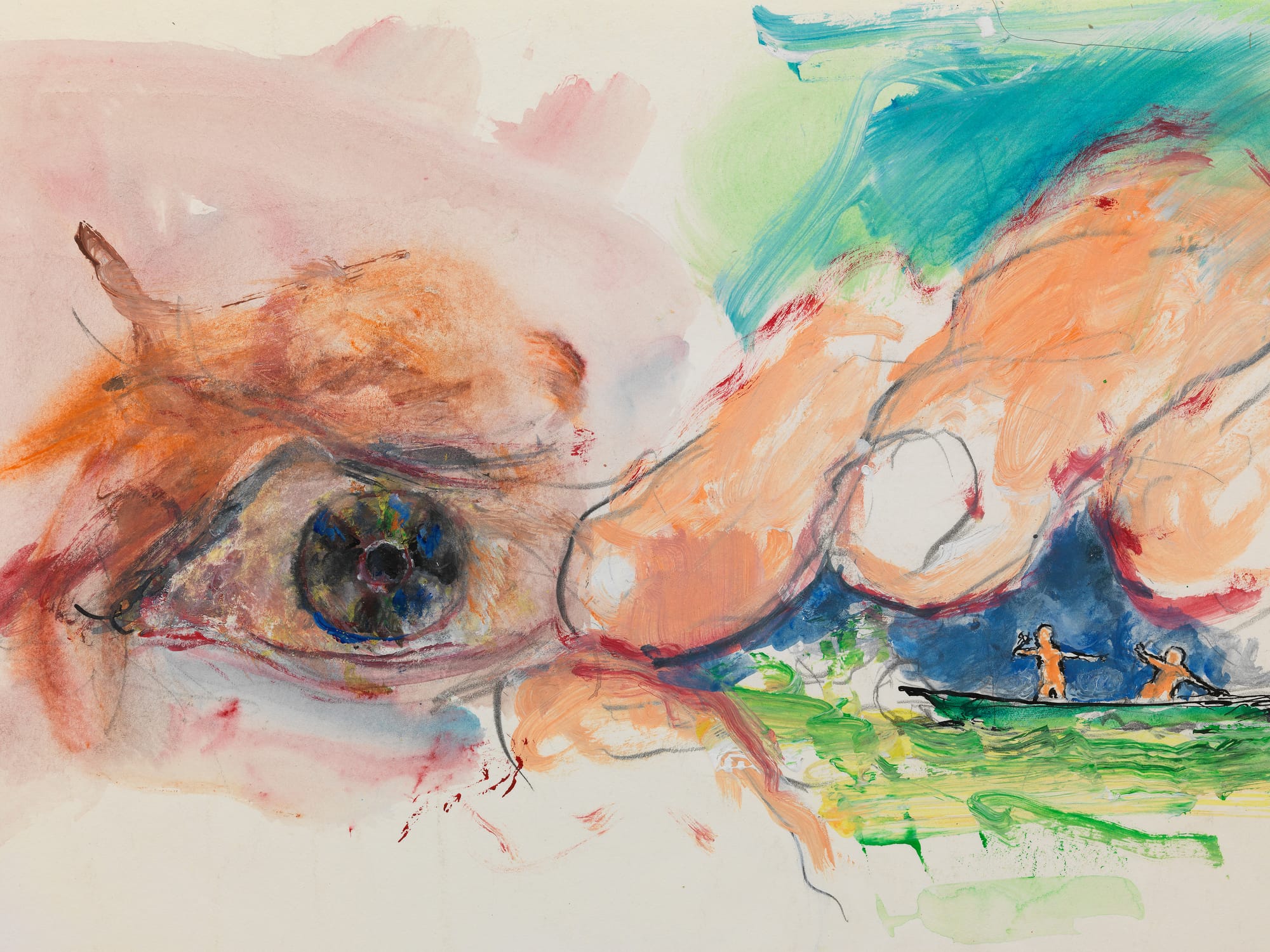 Her work was consistently figurative, spurred early on by a loose association with artists like Leon Golub and the Chicago Monster Roster, and inspiration from Paul Klee and Jean Dubuffet. She studied and taught at the New Bauhaus in Chicago and was never inclined to view art as the pursuit of purity of form or practice. She can sometimes verge on abstraction, especially in her marvelous drawings, which often involve blurred and splotchy surfaces. And she was always looking at the world and its follies, as evidenced in a series of hilarious glasses that look like inverted lenses from a microscope, another favorite tool — see, for instance, “Glasses” (2003), which is included in the Grey Art Museum presentation.