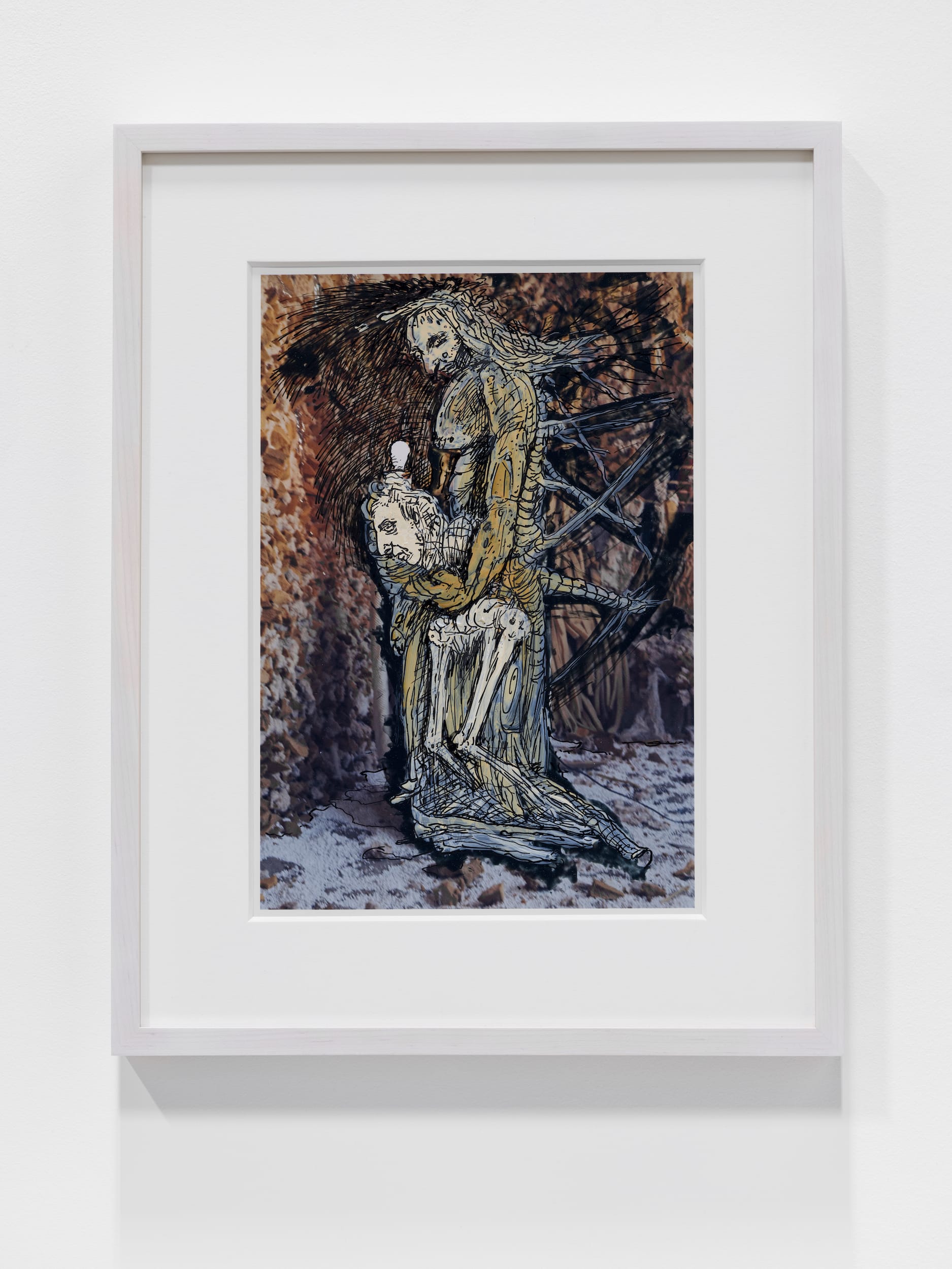 To connect his art solely to these moments, however, is to neglect his complex entanglement of life experience and art historical references — glimmers of Medieval and Renaissance bestiaries and grotesques, the Baroque elegance of his drawings, the influence of Giovanni Batista Tiepolo’s fantastical Vari Capricci (c. 1735–40) and Scherzi di Fantasia (c. 1743–50) etchings. More, though, it misses the active interplay of all of these elements. Jones’s best-known creation, his performative alter-ego Mudman, embodies the artist’s fascination with ritual, mythology, and the grotesque. Shortly after receiving his MFA from Otis Art Institute (now Otis College of Art and Design) in Los Angeles in 1973, he began performing as a self-described “living sculpture” in the area, wearing a contraption made of sticks and foam rubber over his mud-covered body. As the nomadic Mudman, the artist simultaneously disappeared into the surrounding landscape and announced his alienation from the average SoCal passerby.