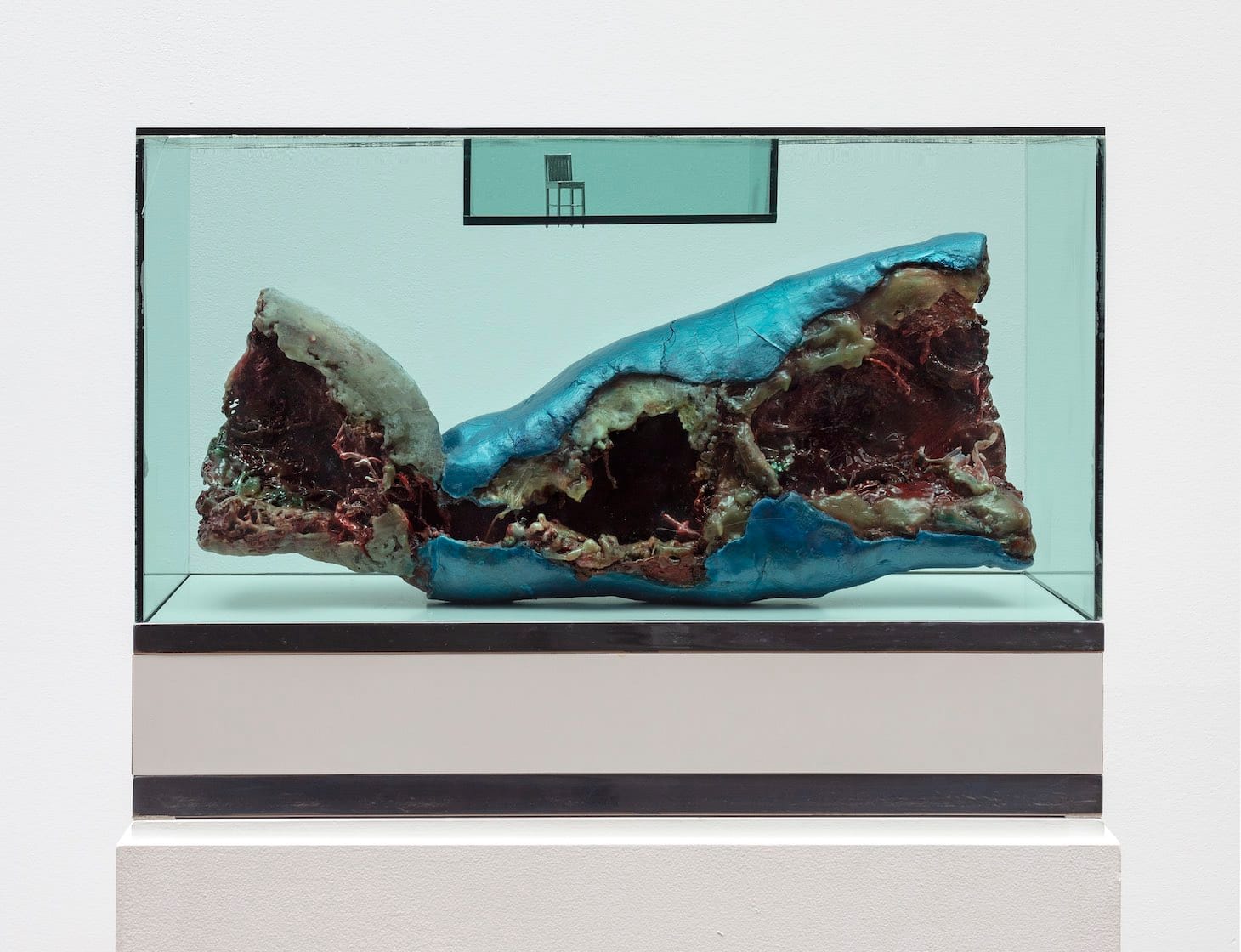 “Untitled (Meat Piece with Chair)" (1966), from the Technological Reliquaries series, is a powerful centerpiece. Inside a glass case is an object that looks like the gaping maw of a fish with its head cut off, its satiny scales shining. The creature’s body seems to be crying out in pain, even without a head to fully express it. A tiny chair keeps watch over the fish-like creature and the gallery, from the top of a small shelf. Equally visceral are the wax-cast fake meats in “Untitled (meat cable)” (1969), which loom over the front gallery. Strung across metal cables, the wax meat resembles little hearts or brains, body parts on display.