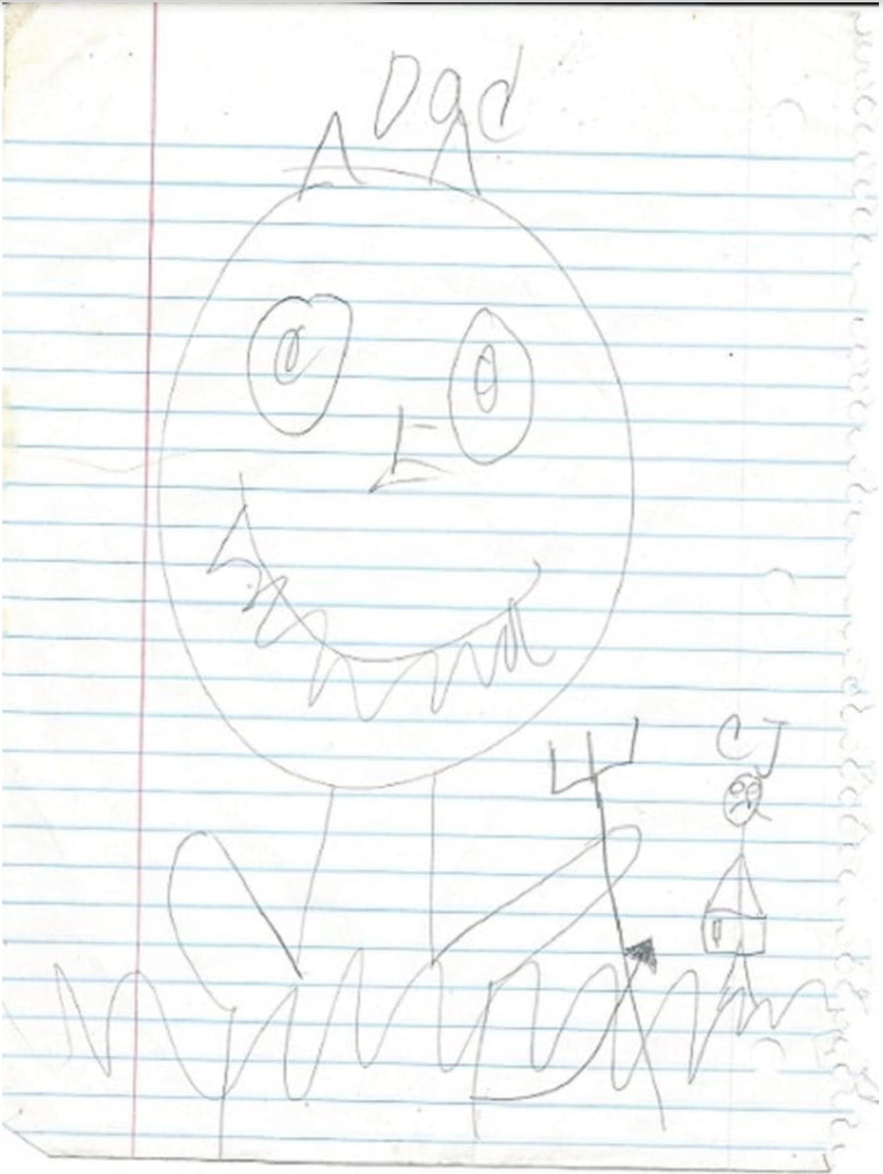 One of McKellar's favorites is a drawing, ostensibly created by a child signed as "CJ," of him and his father. The father, brandishing a pitchfork and grinning to reveal a sharp set of teeth, looms large above the small, frowning CJ.