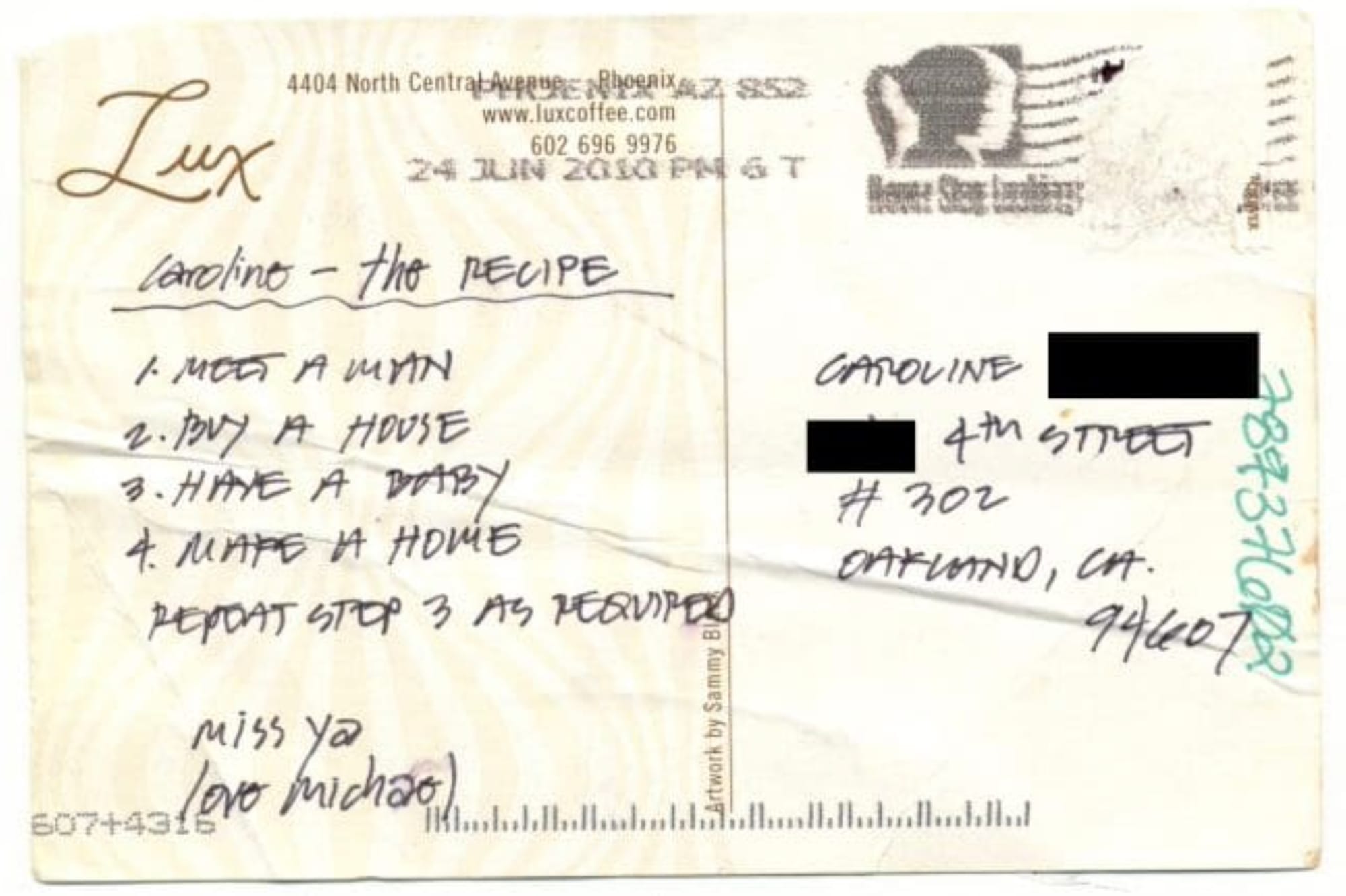 She's also particularly curious about the relationship between two people named Michael and Caroline. In a postcard, Michael details a "recipe" for Caroline: "1. Meet a man; 2. Buy a house; 3. Have a baby; 4. Make a home; 5. Repeat step 3 as required."