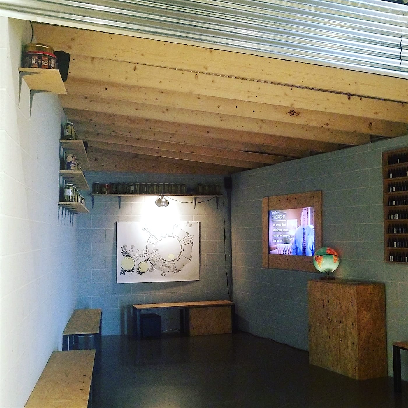 Once in the gallery, these voices — of Cleveland-based men and women interviewed by Sopko and Beallor — draw you into the artists’ faux fallout shelter with its spare shelves of canning jars, rough hewn benches, and box tables, one of which displays a globe that might have sat in a 1960s classroom.