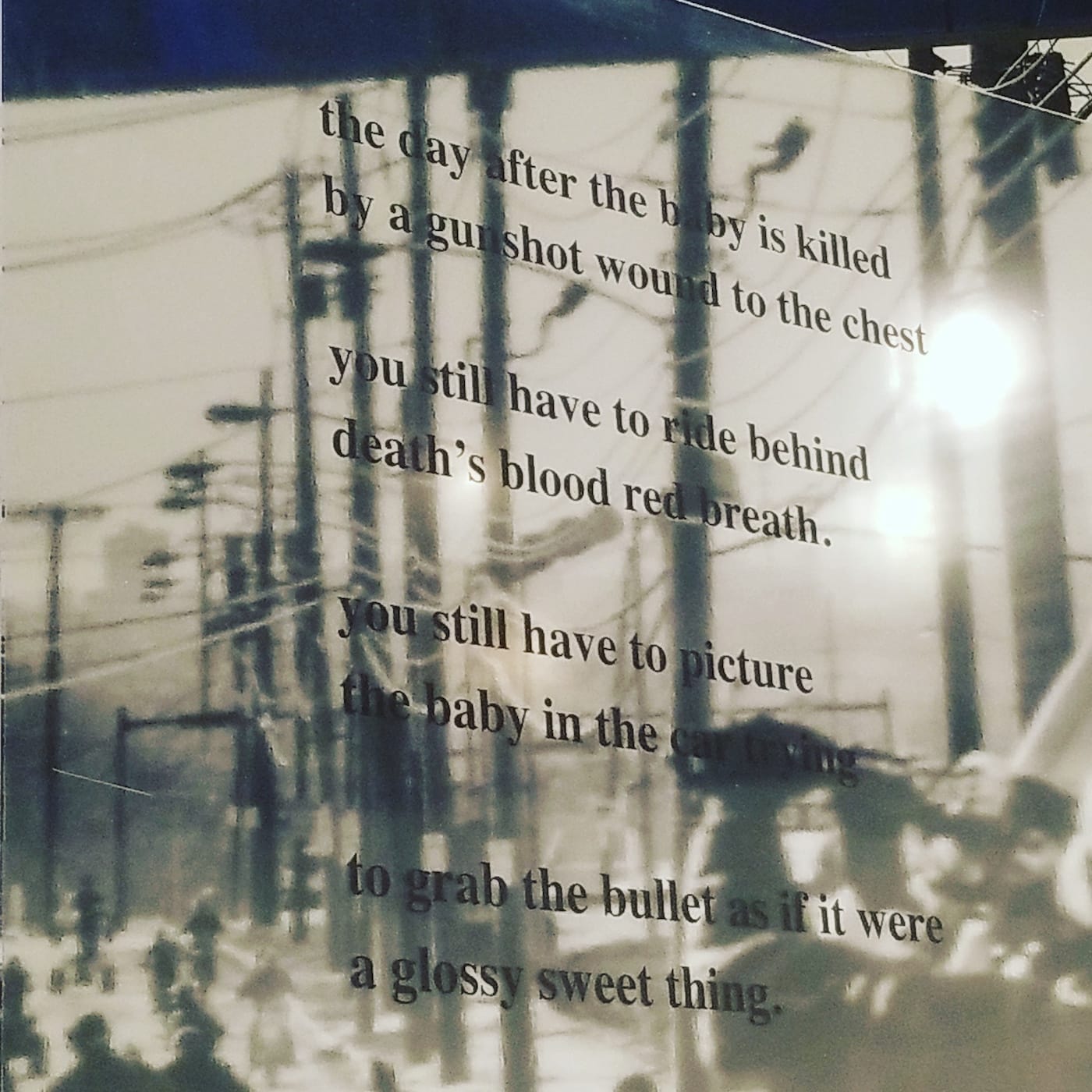 In “Do Not Consider Us Forgotten,” the Cleveland art collective named acerbic presents poems printed in stark, black type interposed over portraits of anonymous Clevelanders in street scenes. The plexiglass piece channels the disfranchised and disaffected population of Cleveland’s “Forgotten Triangle” — a divested minority neighborhood bordered by Kinsman Avenue, Woodland Avenue, East 55th Street, and East 79th Street in the city’s Fifth Ward. “We are here,” one of the most evocative poems, by collective member Ali McClain, declares. “These are our homes.” It is a statement that feels poignant and necessary as the poorer residents of the Triangle are currently being pushed out of their homes by gentrifying “improvement” projects and renovations in infrastructure, including the construction of the so-called “Opportunity Corridor” — a street planned to link East 55th Street at Ohio Interstate 490 to East 105th Street in University Circle and “reconnect” the economically devastated neighborhood to the more prosperous area burgeoning around the Cleveland Clinic and Case Western Reserve University.