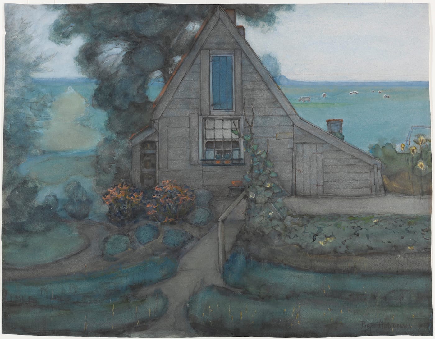 Young Mondrian found his voice as a landscape painter, venerating the natural world while altering its tone, mood and texture. A standout is “House” (1889-1900) which synthesizes academic realism with an incipient Impressionism. Blue-green washes in gouache and watercolor depict a garden teeming with spiky, trellised flowers and whorling tree branches. In the distance, cattle graze on sea-colored pastureland underneath a speckled, radiant sky. The fluidity of the landscape’s natural beauty provides a distinct foil to the angular heft of the gray, wedge-shaped clapboard house that dominates the picture plane.