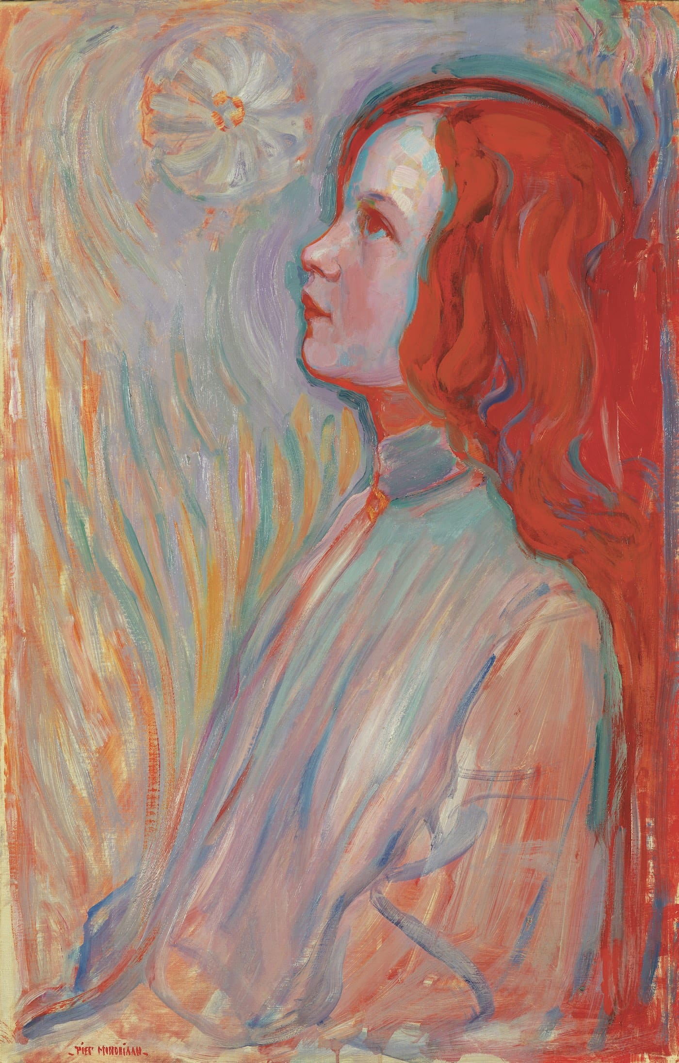 By now, Mondrian had joined the Dutch branch of The Theosophical Society. In particular, he had internalized theosophy’s hermetic quest to make visible those embedded truths that defy direct observation and empiricism. Two engrossing self-portraits in charcoal and crayon capture this newfound mysticism. In these shadowy renderings, the artist resembles a bearded, long-haired hippie 60 years ahead of the Summer of Love. His large, dark, hyper-vigilant eyes stare back at the viewer, as if to communicate a heightened consciousness.