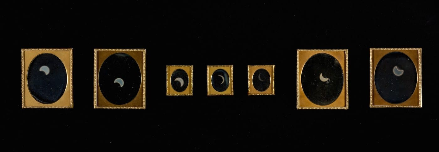 Eclipse documentation continued to progress in the 19th century, with greater sensitivity on photographic plates resulting in more detailed images. On May 26, 1854, William and Frederick Langenheim of Philadelphia created a series of daguerreotypes documenting the phases of a North American annular eclipse. These images, made with a small camera that needed little light, are now at the Metropolitan Museum of Art, which states this was “the first total eclipse of the sun visible in North America since the invention of photography.” The Met notes that “six other daguerreotypists and one calotypist are known to have documented the event.” Solely the Langenheims’ work survives, showing a mirrored eclipse on the uncorrected daguerreotypes.