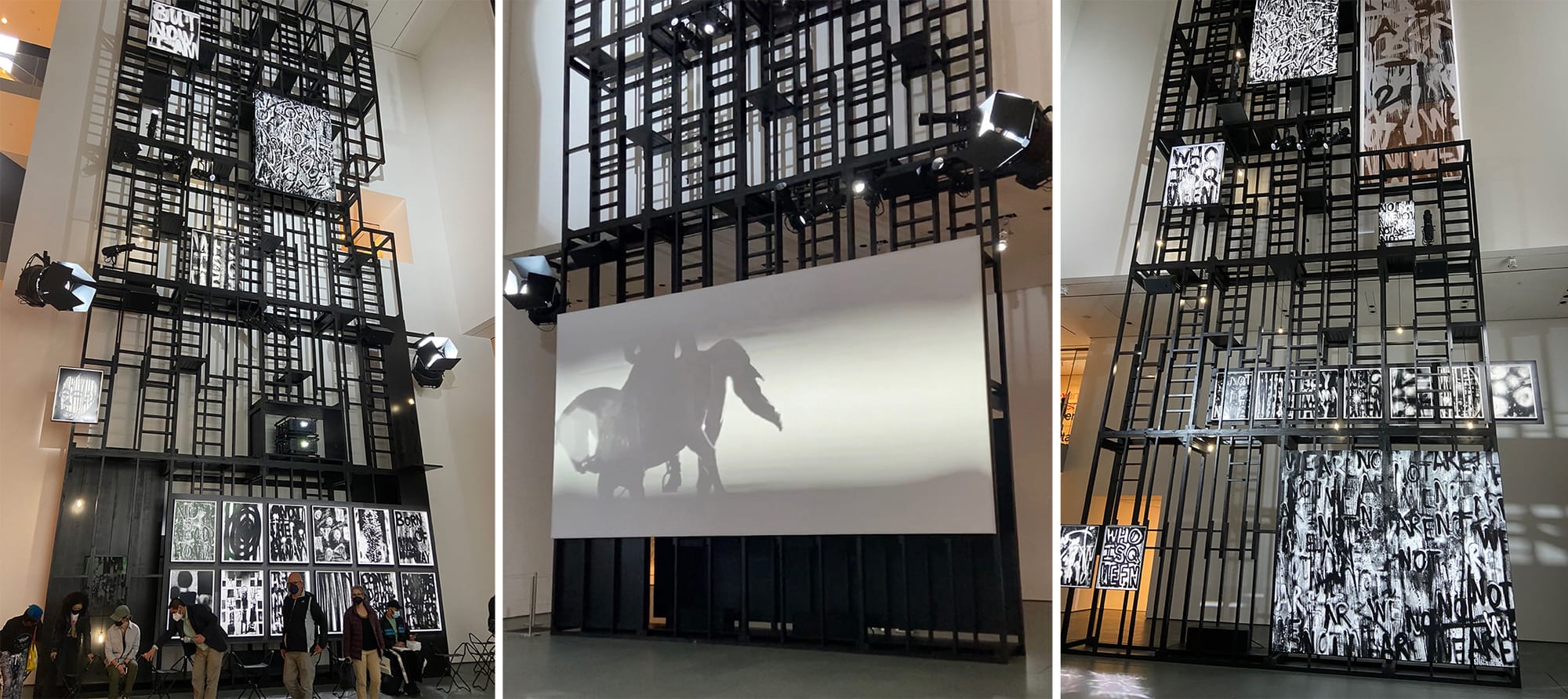 Adam Pendleton’s Who Is Queen? bristles with colossal unrest. Covering the Museum of Modern Art’s (MoMA) central atrium, the installation’s towering presence is buttressed by a five-story black scaffold, a skeleton-like container that enshrines a bricolage of two-dimensional works on silkscreen as well as wooden sculptural works. The centerpiece of the installation is a dialogue between two films: “Notes on the Robert E. Lee Monument Richmond, VA (figure)” (2021) and “Film Notes on Resurrection City” (2021). A third film, “So We Moved: A Portrait of Jack Halberstam” (2021), intermittently intervenes in the narrative, screening daily at 12:30 and 4:30pm. Cast in a crisp, theatrical white light, Pendleton’s installation transforms the atrium into a stage for riotous unfolding of a total work of art; a tempestuous assemblage of film, sculpture, and sound that immerses visitors in the unstable throes of protest and struggle.