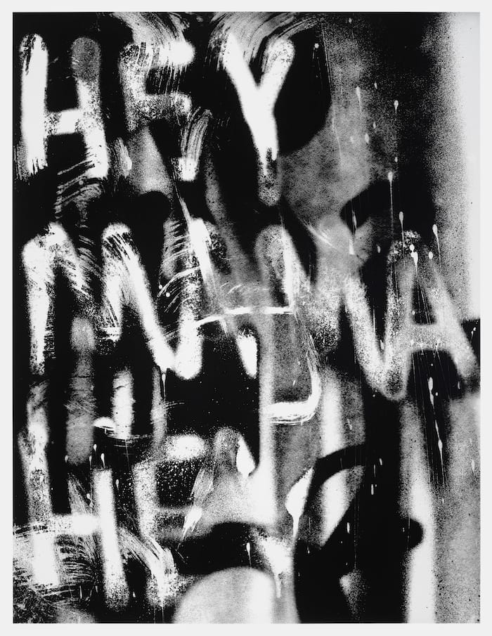 In fact, monochrome — a staple of Pendleton’s oeuvre — structures the entire installation. In the text-based silkscreen works that decorate the scaffold, monochrome both obscures and makes meaning. In a catastrophe of the written word, dense layers of black and white graffiti-like lettering crowd the panels, piled successively on top of one another. We are left with the textual equivalent of the scream: words and sentences are broken into letters that vie for visibility, layers and layers of text seem to shout at us, refusing the ease of legibility that our eye craves. Buried in this thick buzz of calligraphy, I was reminded of the graffiti that has come to crowd the base of the Robert E. Lee monument Pendleton takes up in his film — that restless display of words that has become one of many signifiers of rebellion against the ordering logic of white supremacy.