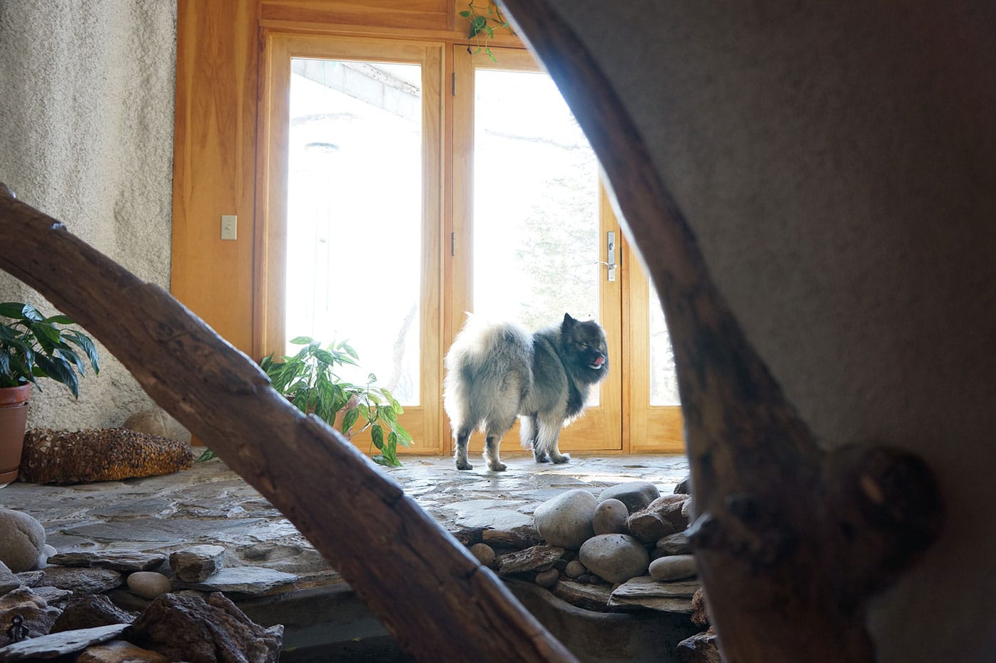 In her home, this awareness is demonstrated in the way she’s used the built environment to highlight the natural one. Nothing feels predetermined; everything is fluid and irregular, keeping your eyes in motion and your ears perked. Birds call out, a dog rustles, quiet splashes in a small indoor pool alert you that fish are navigating the same space that you are. The overall impact is one of liveliness. Each element that your eyes or mind encounter is calming, but your mind is never allowed to fall into the habit of predicting what will happen next and then tuning out. The patterns and surfaces keep you present in a way that blank white walls never could. You don’t shut down. When the walls, floors, stairs, handrails, doorbell cover, and living creatures all call for your presence, staying present begins to feel much more important than it does when you see a prompt on a coffee mug.