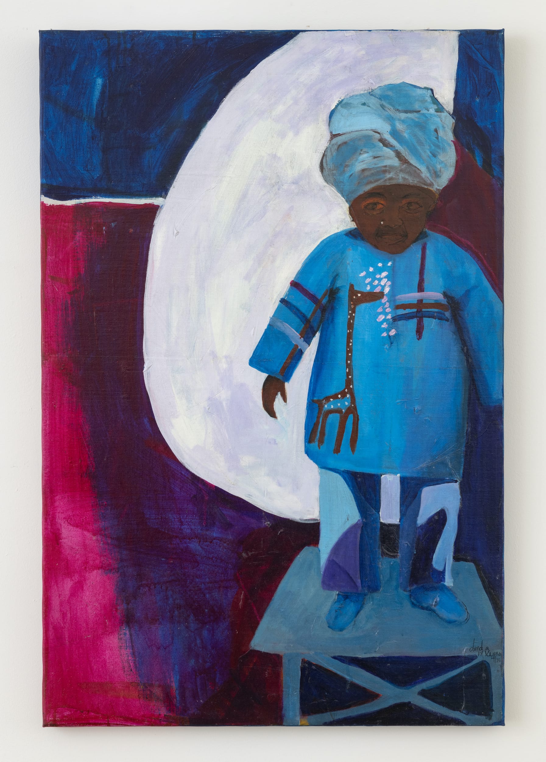 Birds also traverse the canvas of Dindga McCannon’s “Pat Is Pregnant” (1977). Paint smeared with thick, relief-like brushstrokes melds with bits of patterned fabric. McCannon depicts photographer Pat Davis with flushed cheeks, her head tilted down, eyes shut. Her thighs open around her swollen belly, draped by a beaming, bright orange tunic. A sliver of the full silver moon peeks into the frame through the window, mirroring her pregnant stomach. Sinking into a sofa, Davis recalls an odalisque; however, the artist’s caring gaze toward this collaborator and fellow artist reflects a sense of autonomy and peace, refusing the sexualization or exoticization characteristic of the canonical Euro-American painting trope.